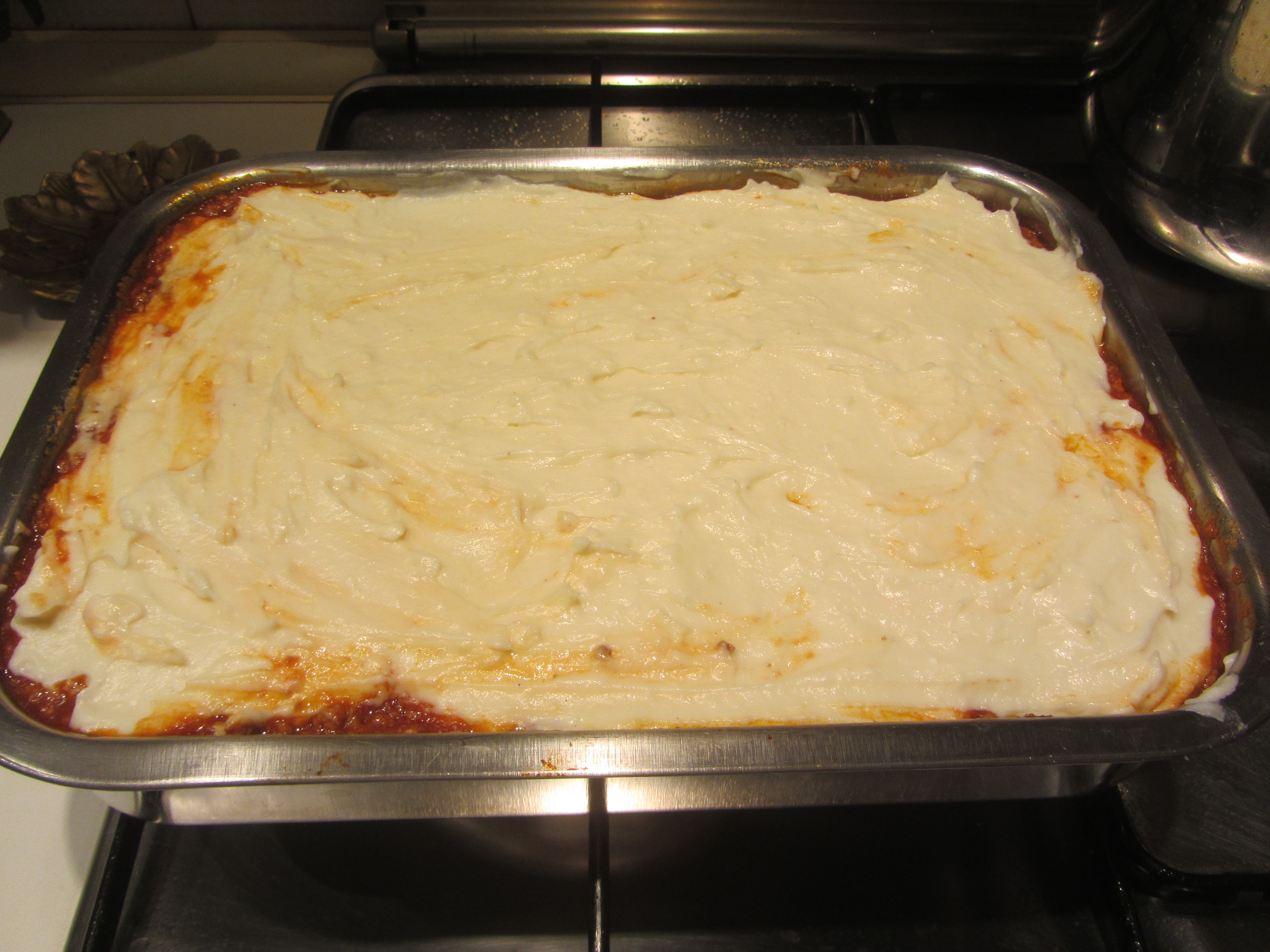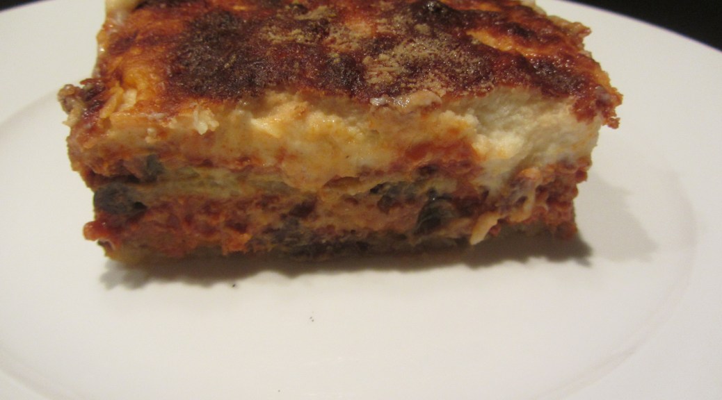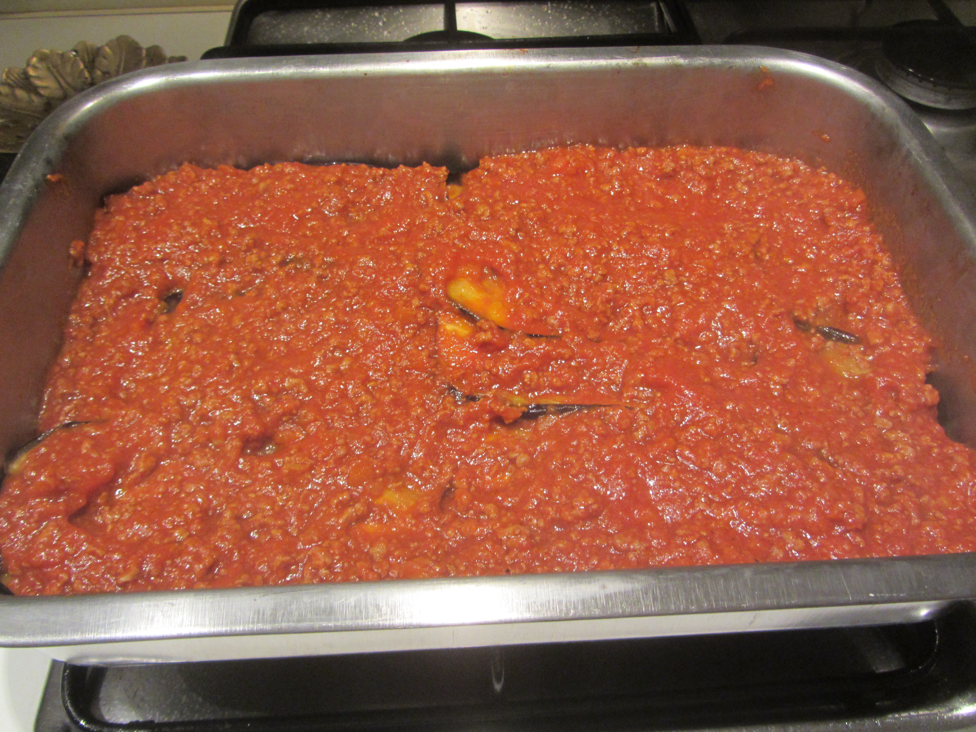 Dunque, è ovvio che si tratta di una specie di mussakà, c’è la versione turca e quella greca, libanese, ecc, gli ingredienti cambiano o si aggiungono, besciamella si, besiamella no, carne di ovino. Bon! Io il ragù l’ho fatto col manzo. Accorgimento: la besciamella deve essere sostenuta, se si usa quella troppo liquida non si sforma bene.
