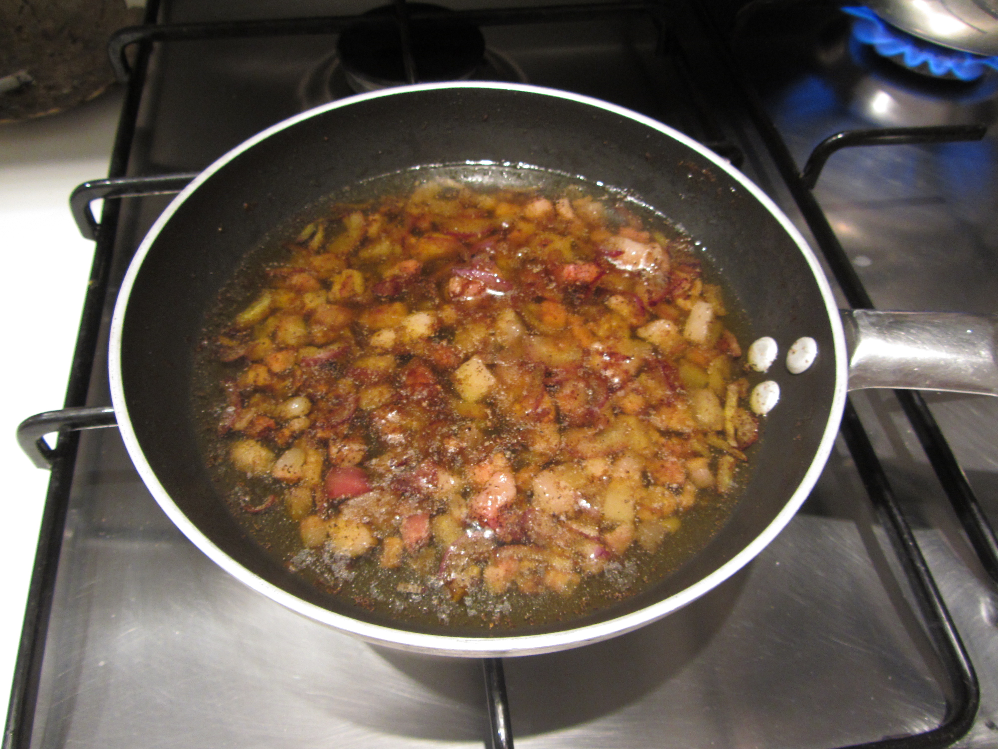 Faccio rosolare il tutto a fiamma bassa, il guanciale mi piace croccante fuori ma morbido complessivamente. Spengo la fiamma quando l’ aspetto risulta come nella seguente foto: