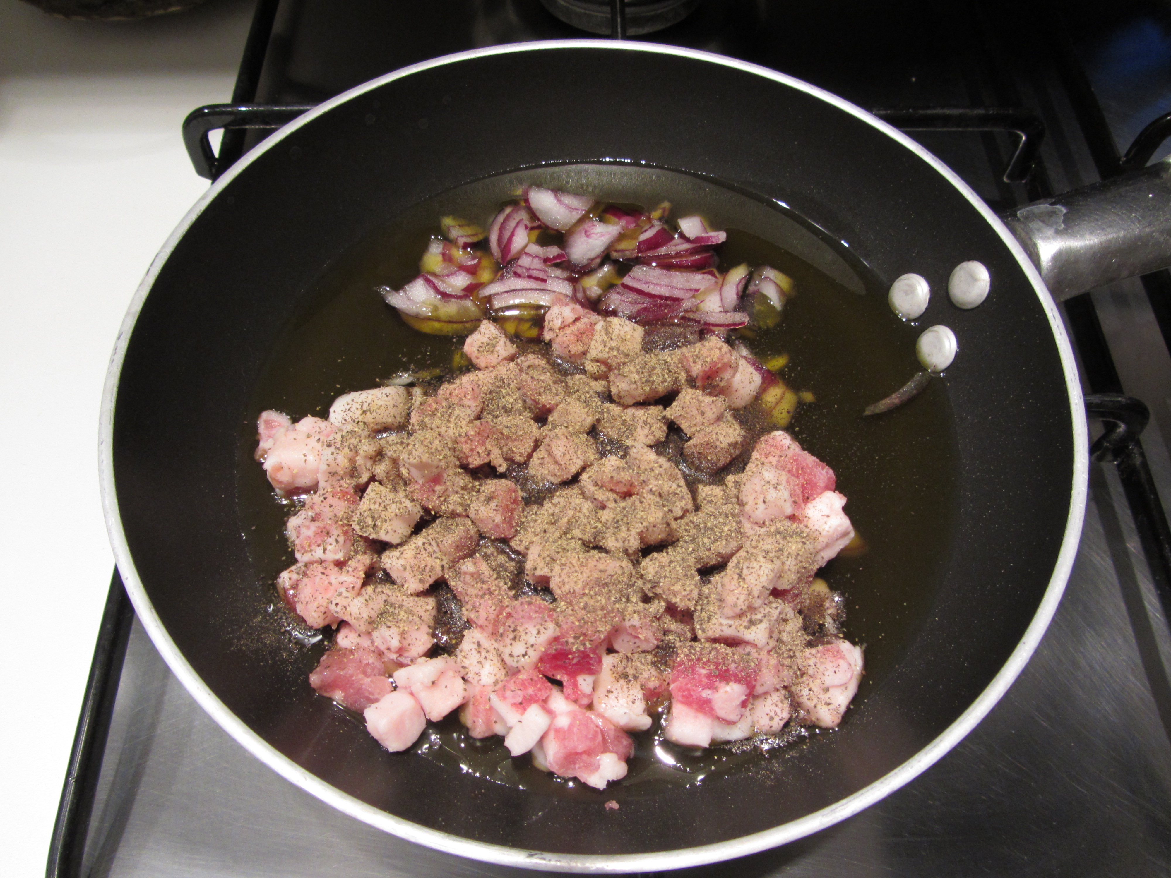 Nel frattempo che la pasta cuoce in abbondante acqua bollente e salata, preparo in una padellina l’olio extravergine, i cubetti di guanciale, la cipolla ed il pepe.