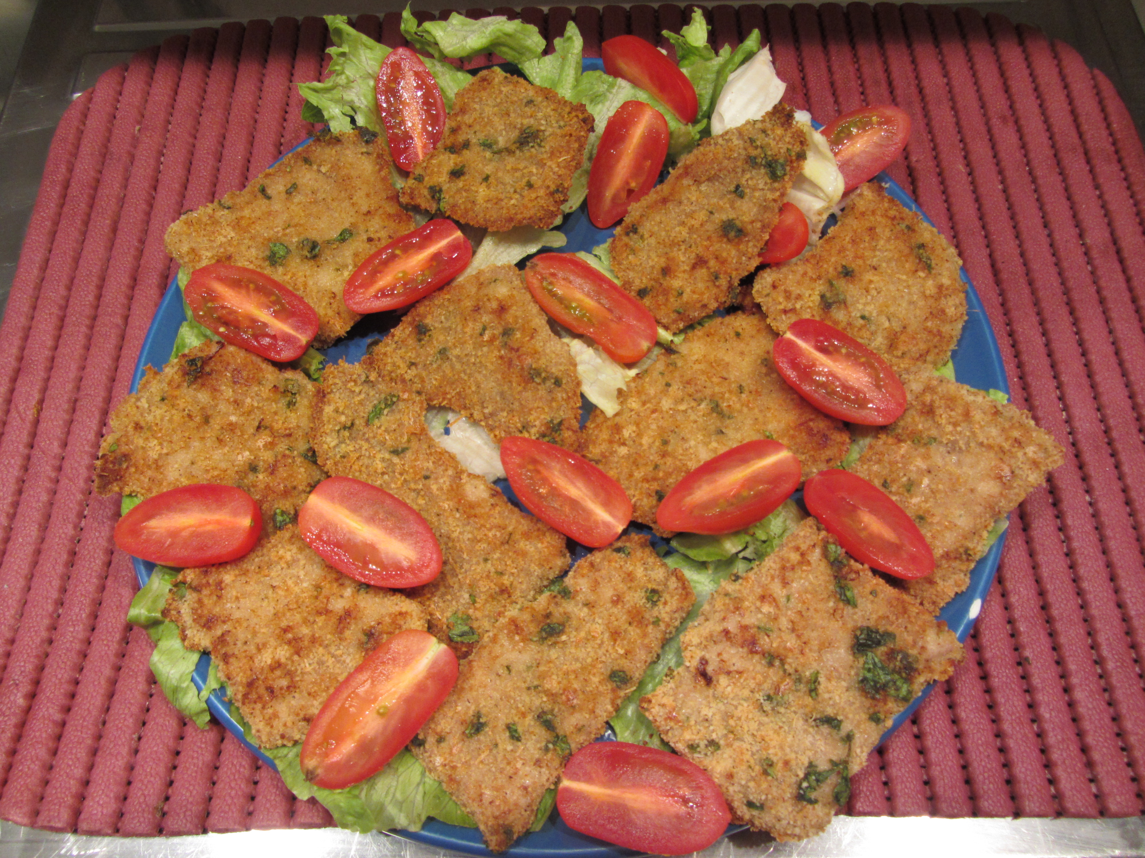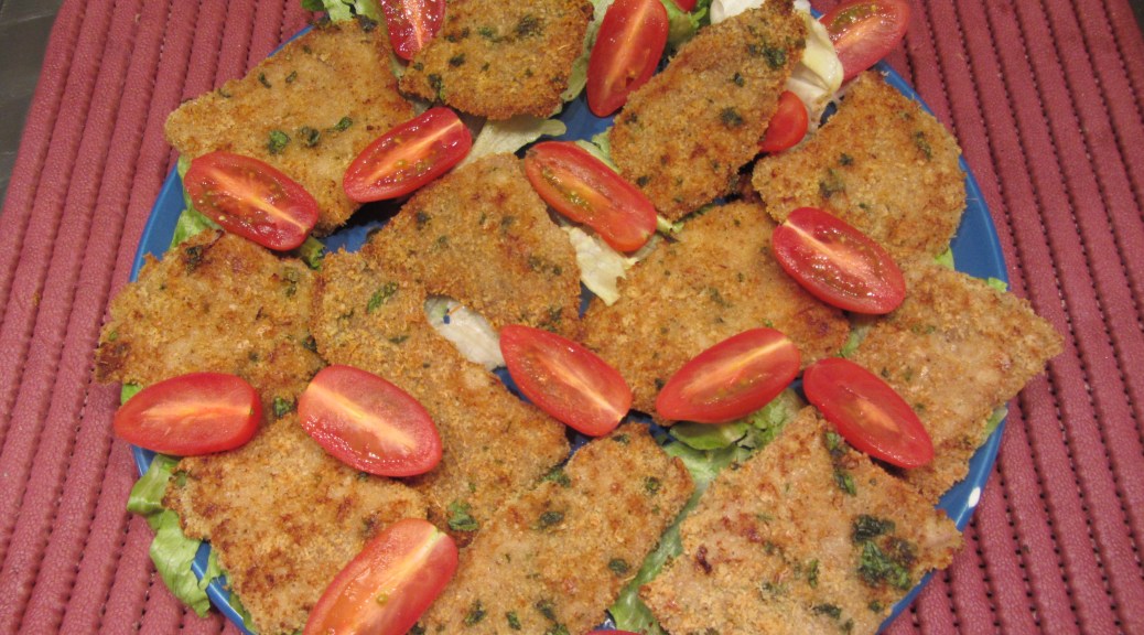 Qesto è un tipico esempio di cucina “fusion”, la cotoletta, tipico piatto meneghino con panatura calabrese 🙂 . Cuociamo in forno per tenere a bada il colesterolo (detto da me è un pò bizzarro..) e realizziamo dimensioni mini, fanno più tenerezza.
