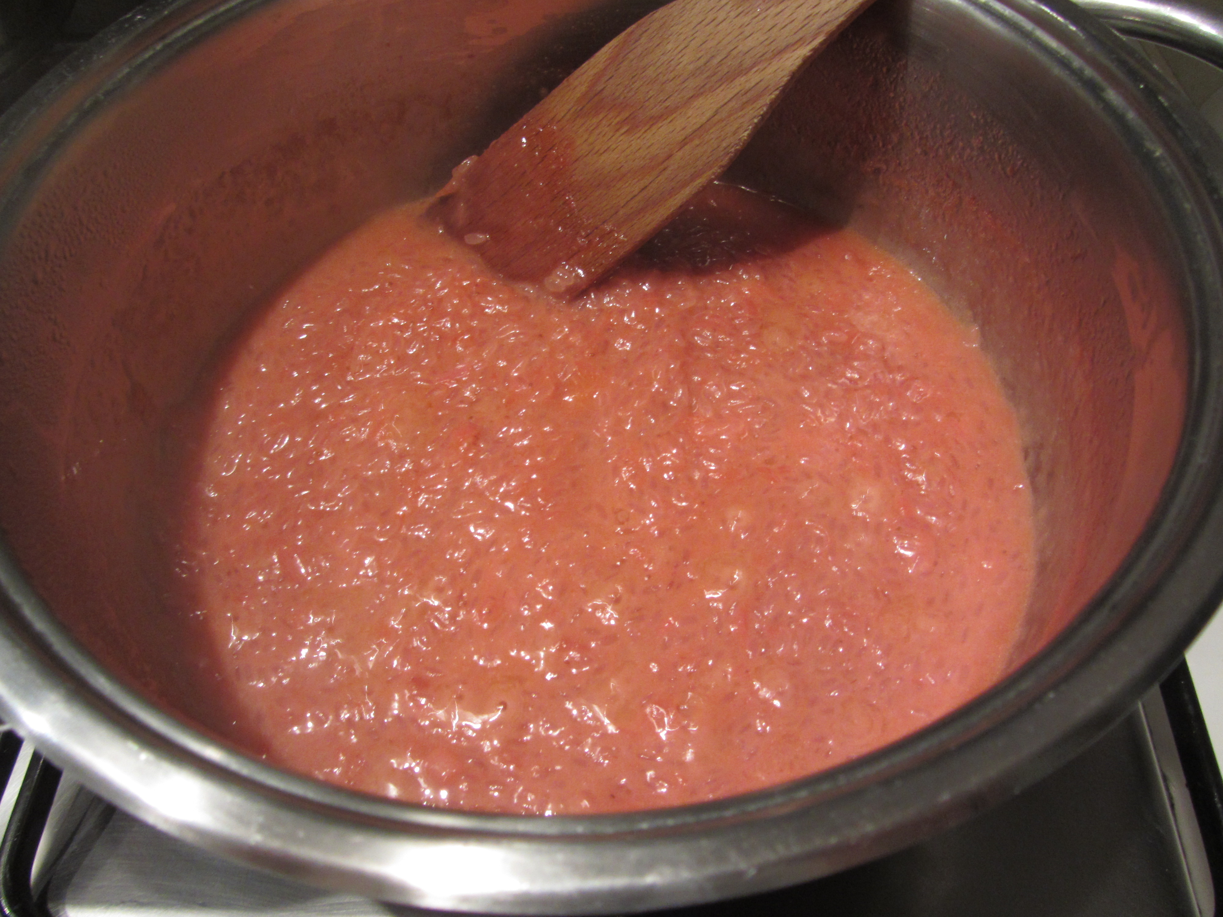 e dopo aver scaldato ancora un pò aggiungete il vino bianco e, con pazienza, mescolate su fiamma bassa, sino a quando le fragole avranno perduto la loro forma, aiutatevi con una spatola di legno. Alla fine di questa operazione otterrete una purea rossa: