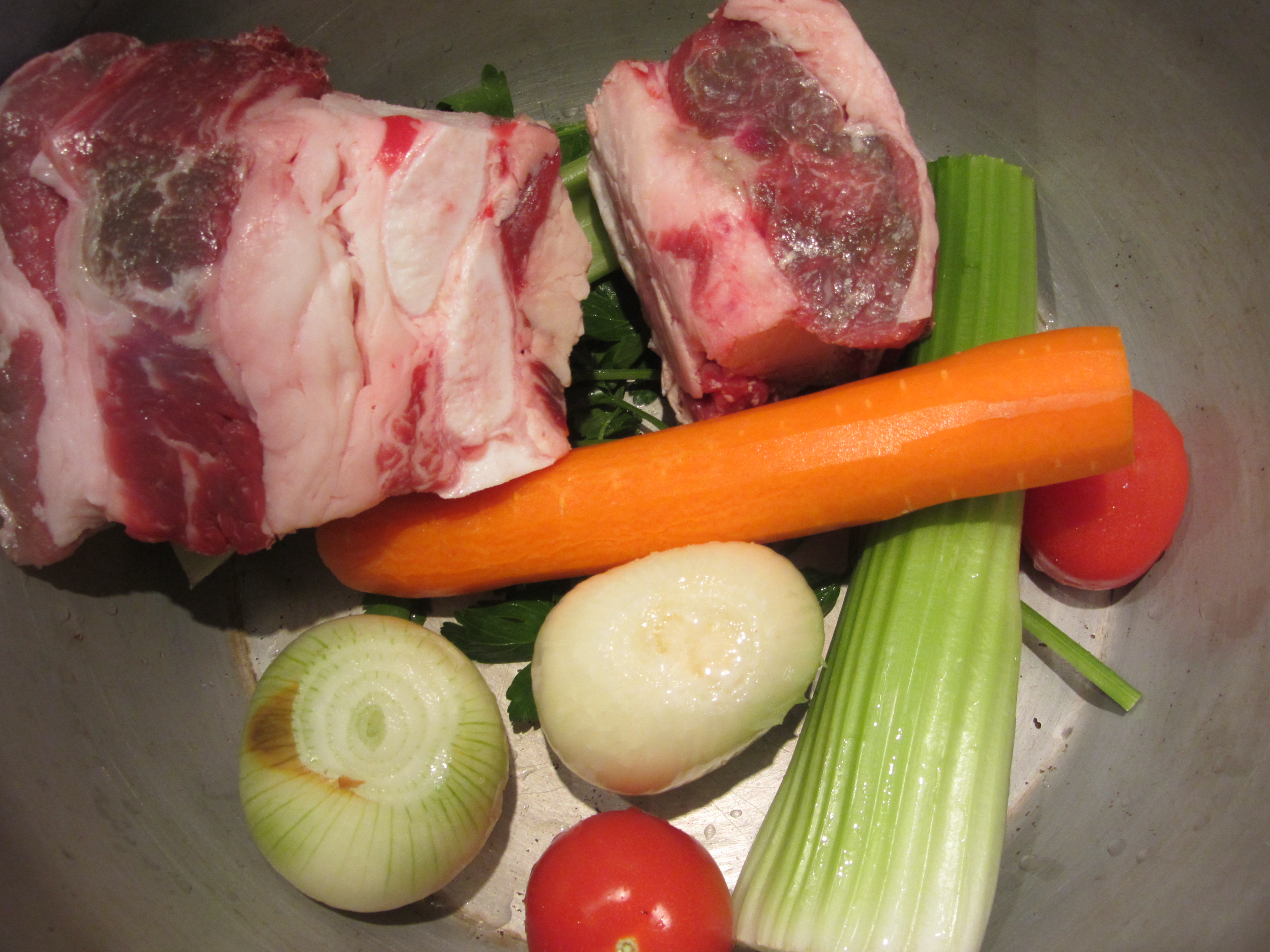 Carota, sedano, cipolla, non più di due pomodorini, un pezzo di biancostato di manzo.