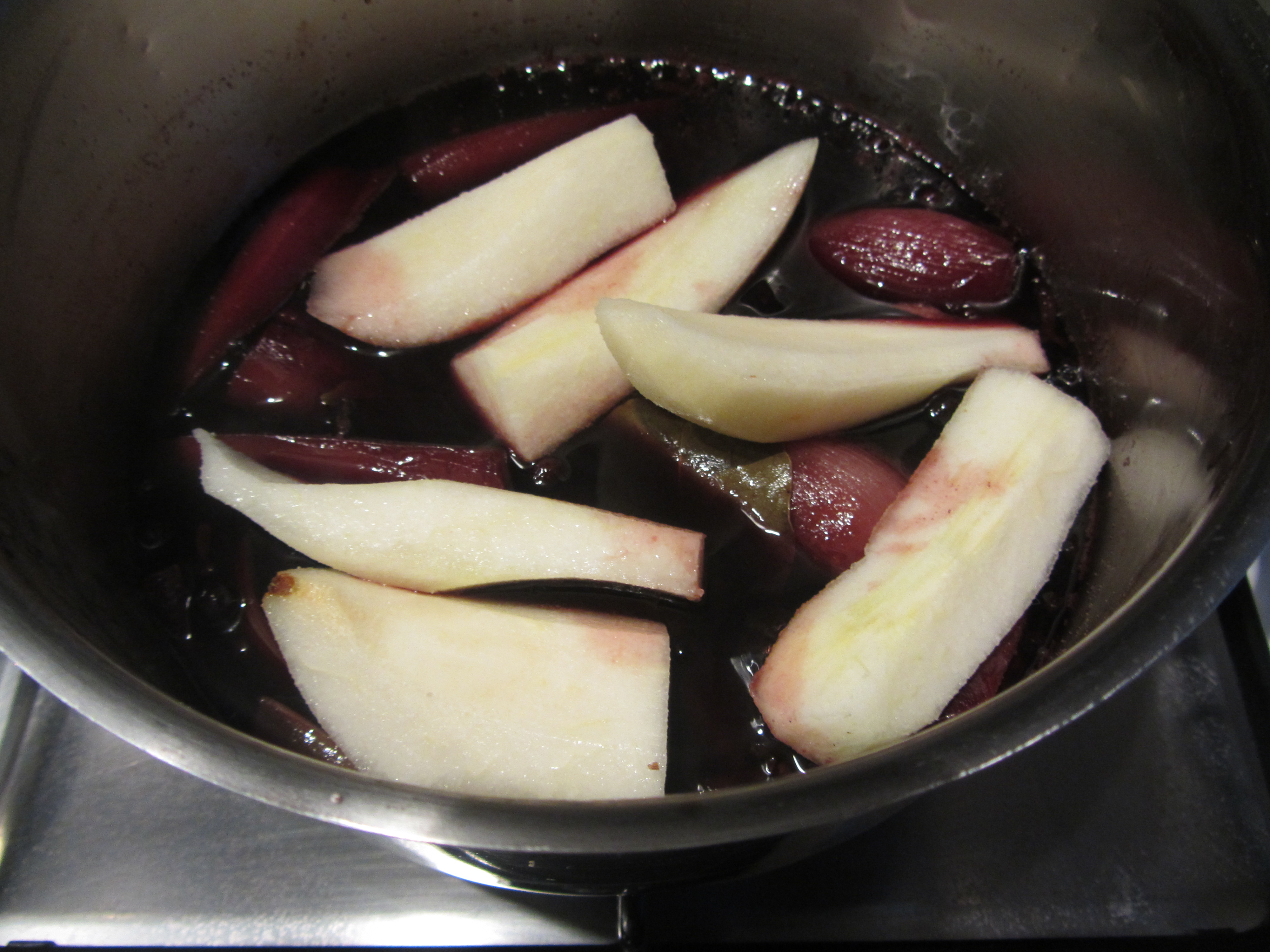 e quando, a fiamma alta, inizia a bollire ed avrà eliminato l’alcool, abbassare la fiamma e fare andare a fiamma bassa per due ore e mezza. Aggiungete due pere kaiser sbucciate ed in pezzi e fate andare 20 minuti.
