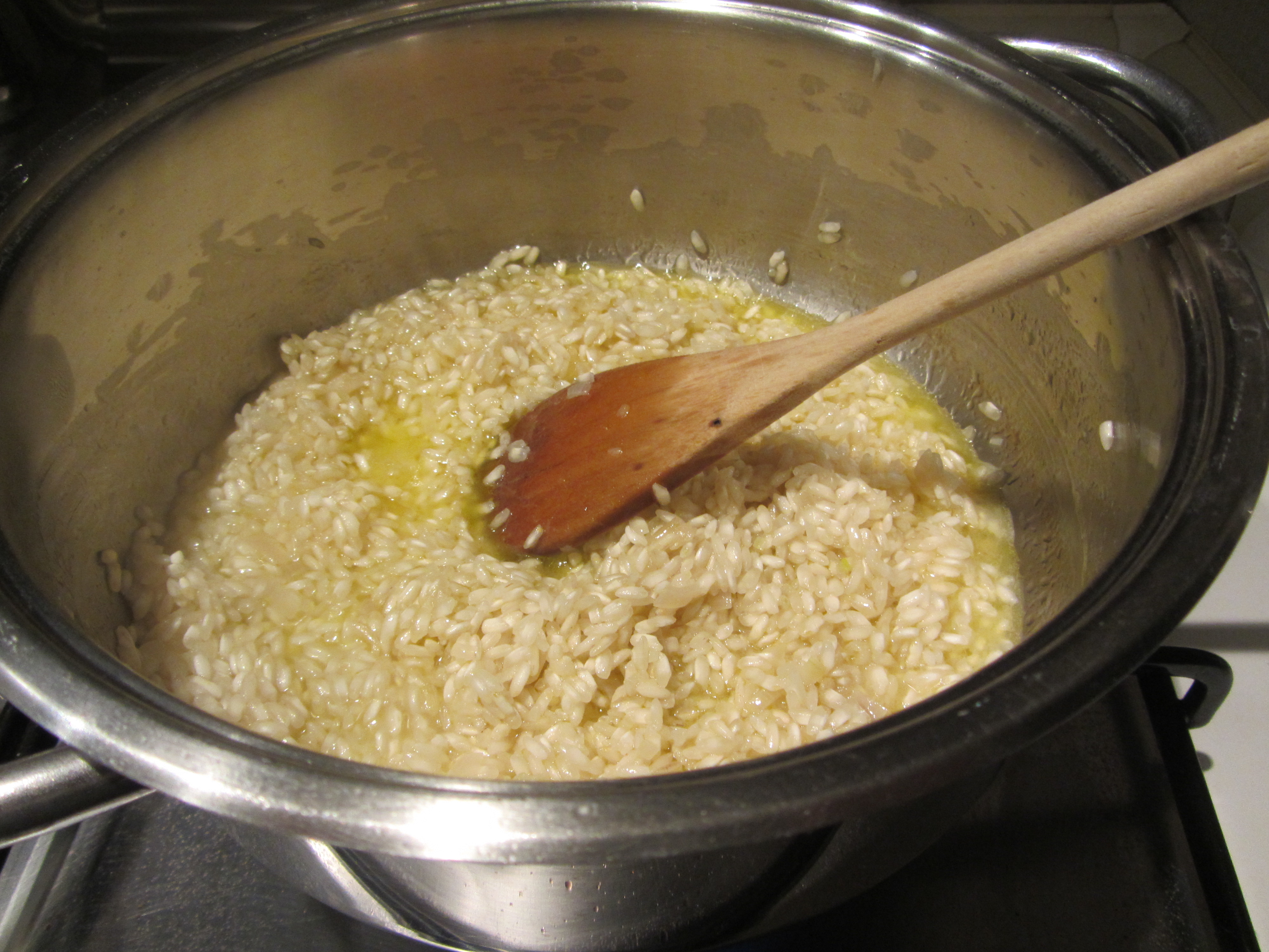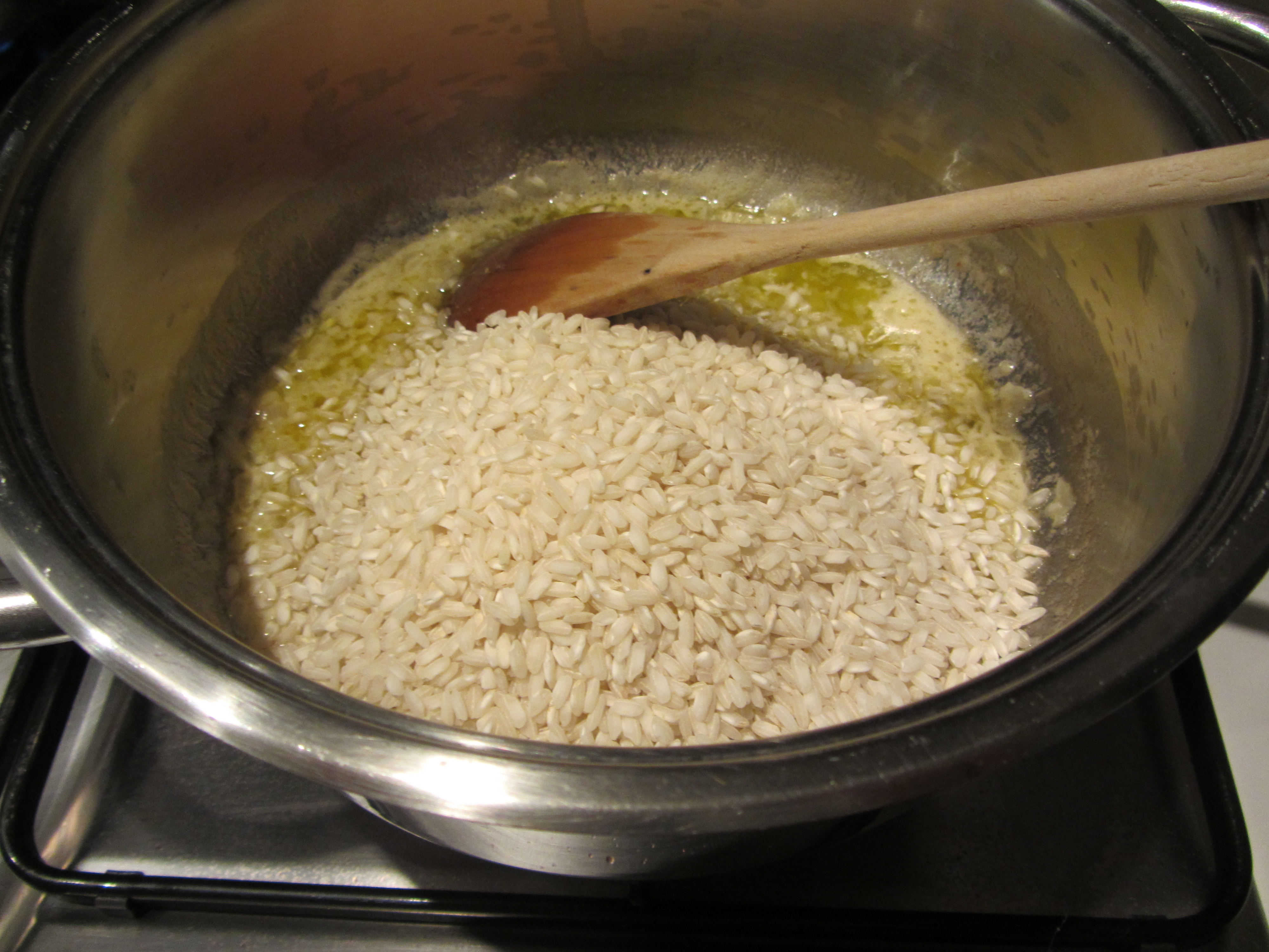 Preparate il risotto facendo dorare lo scalogno senza colorirlo,
