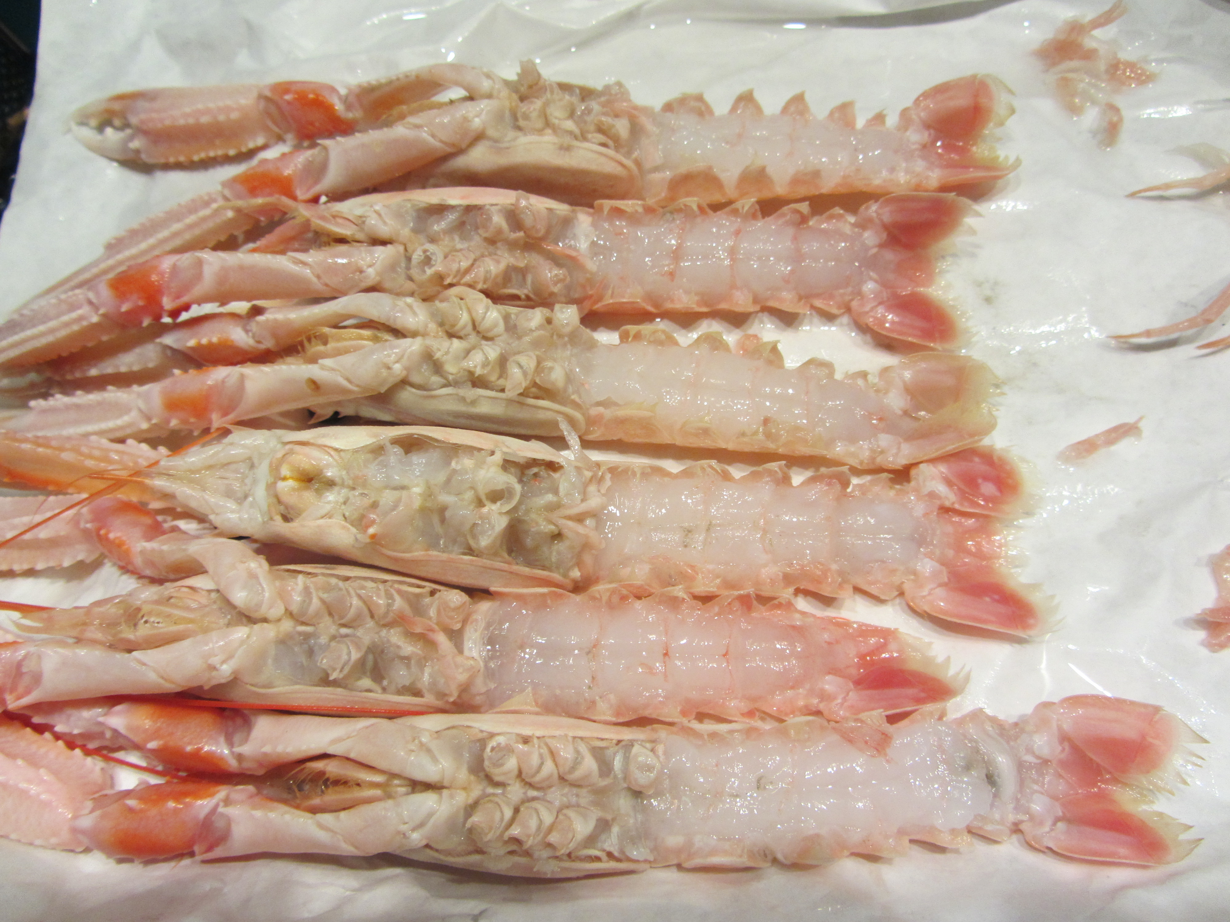 Per quanto riguarda gli scampi con una forbicina rimuovete la parte che protegge la polpa delle code.