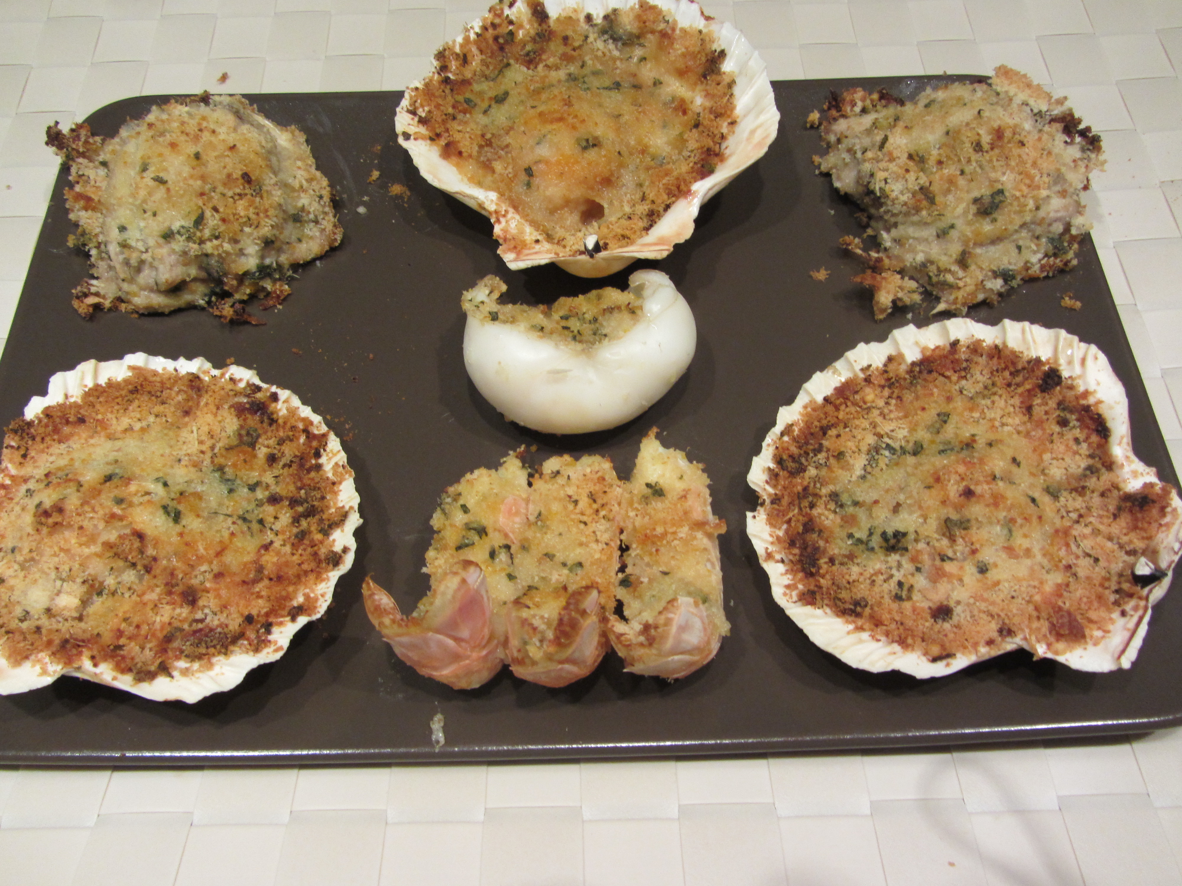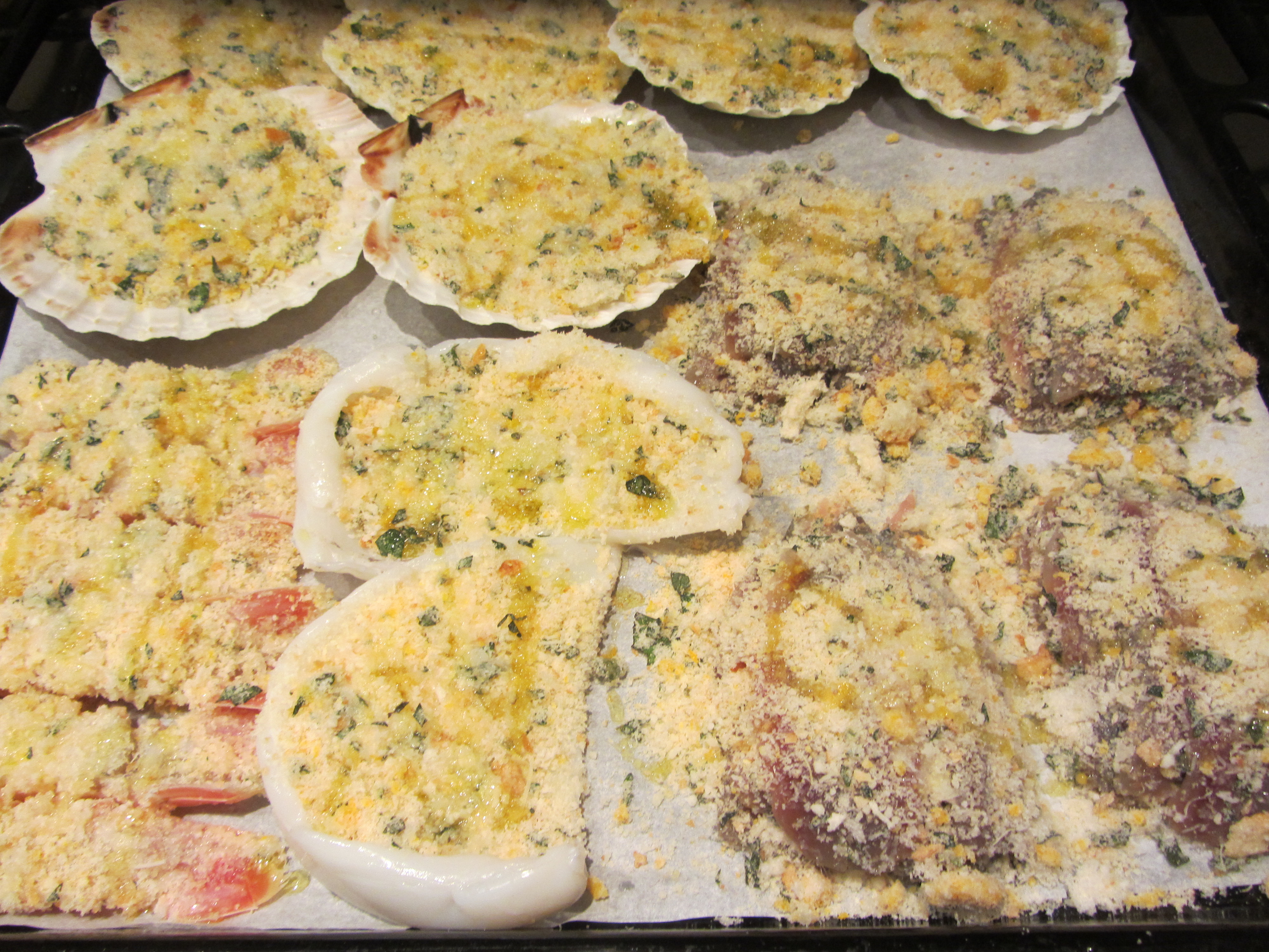 Ieri sono uscito dal lavoro per andare a casa con la voglia di un gratin di mare. Avevo però voglia di un gratin come lo avevo assaggiato in un ristorante qualche tempo fa, ovvero con una panatura a grana grossa di mollica semifresca e qualche aroma particolare. Allora mi sono ingegnato con un discreto risultato.
