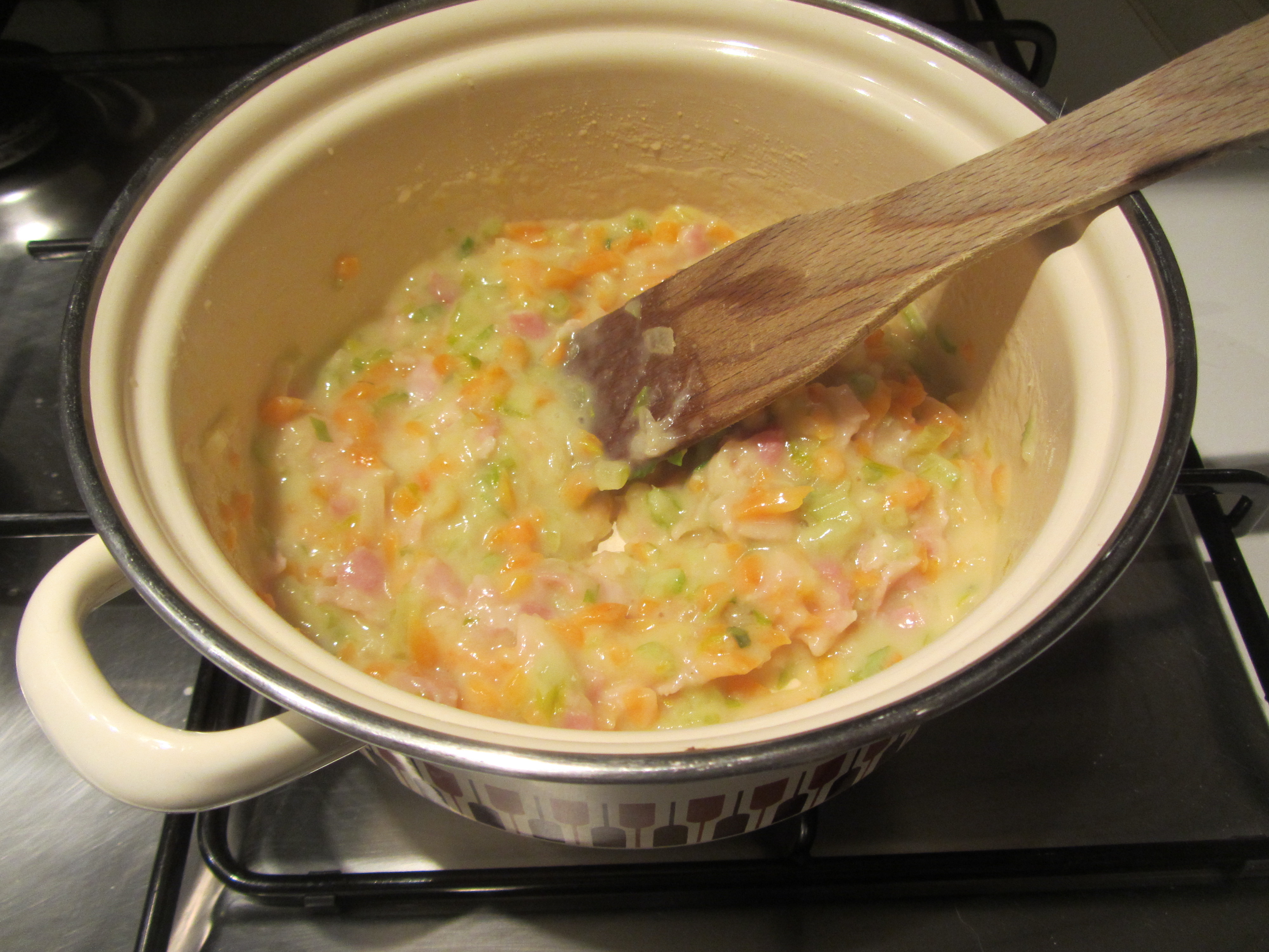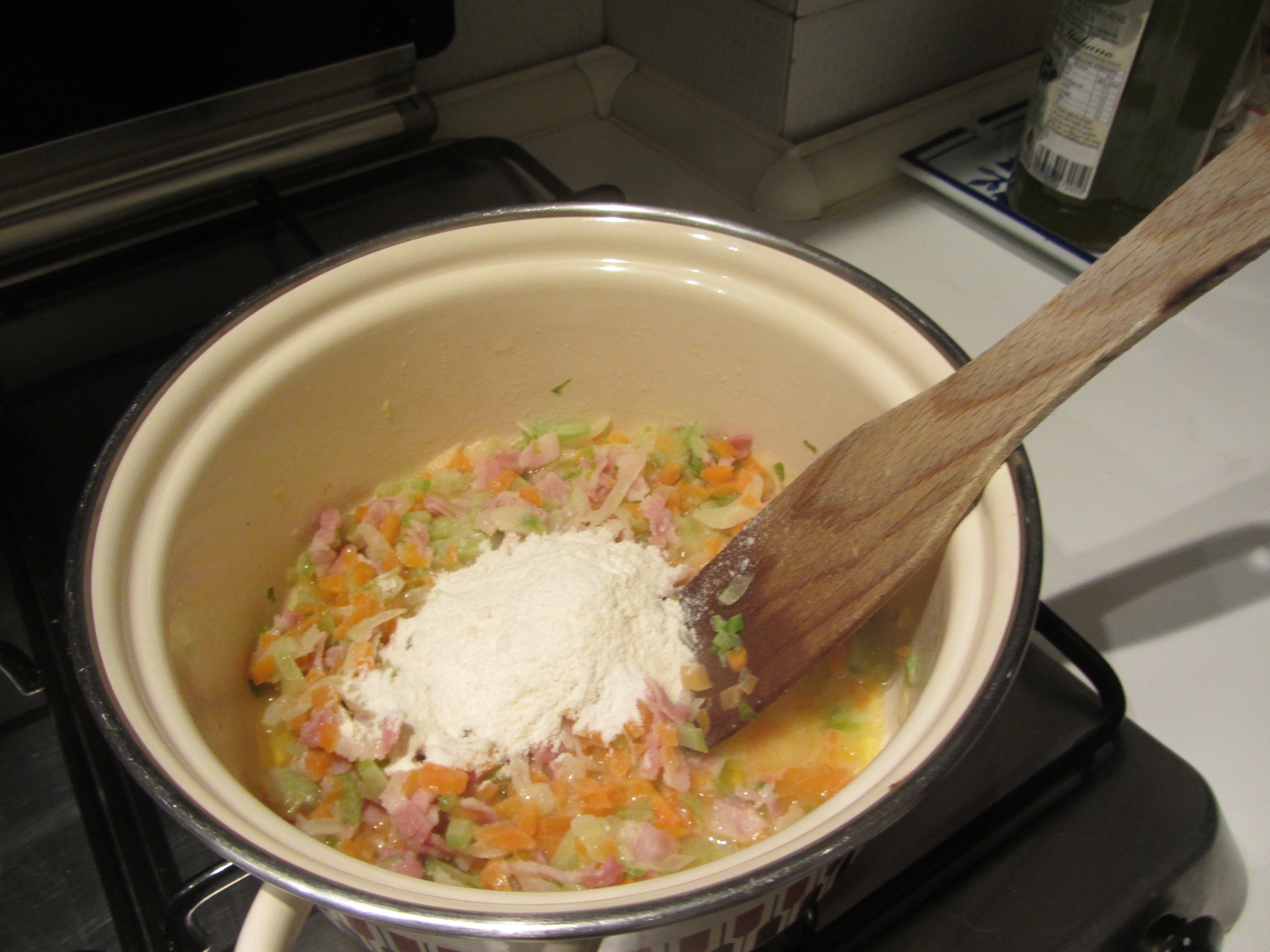 Aggiugere prima l’acqua delle vongole e poi della farina al battuto e bacon rosolati.