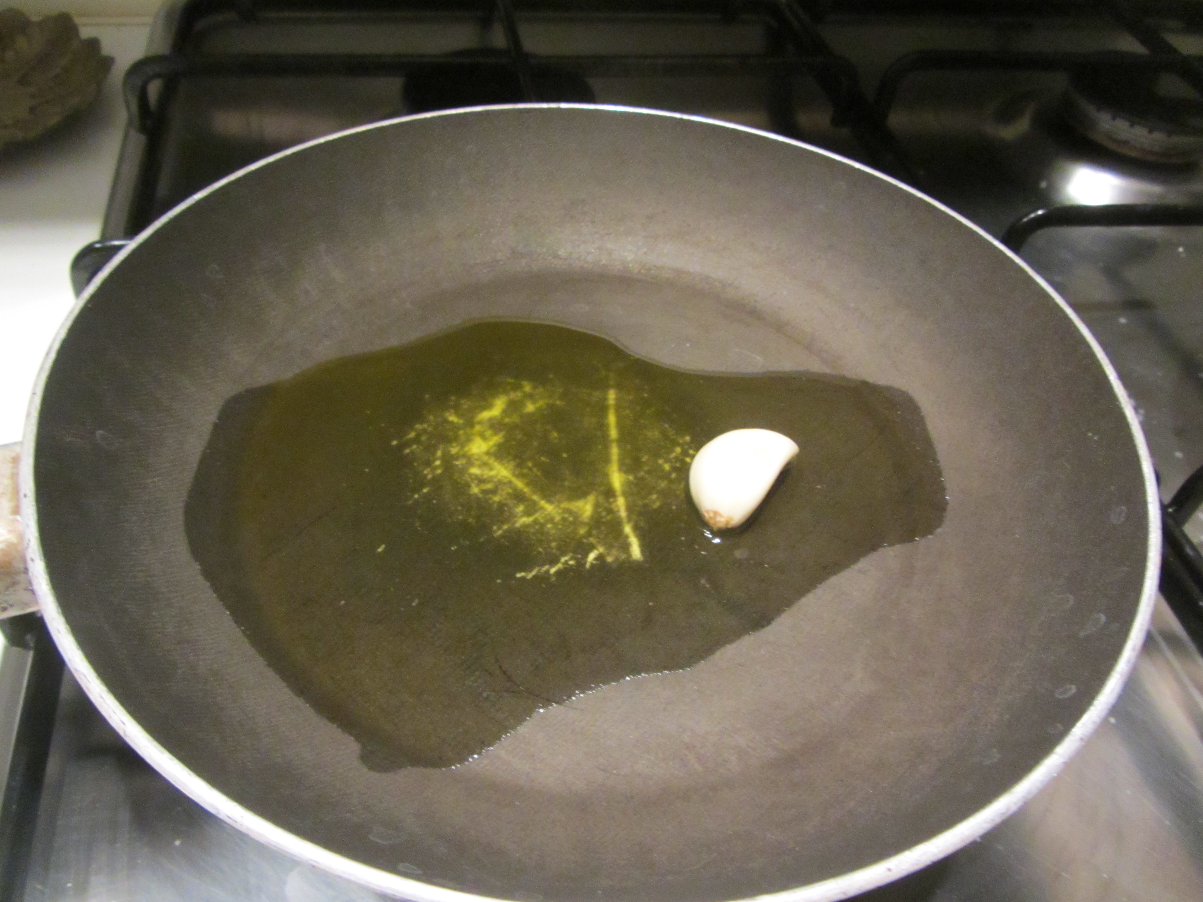 Rosolare uno spicchio di aglio in olio extravergine di oliva