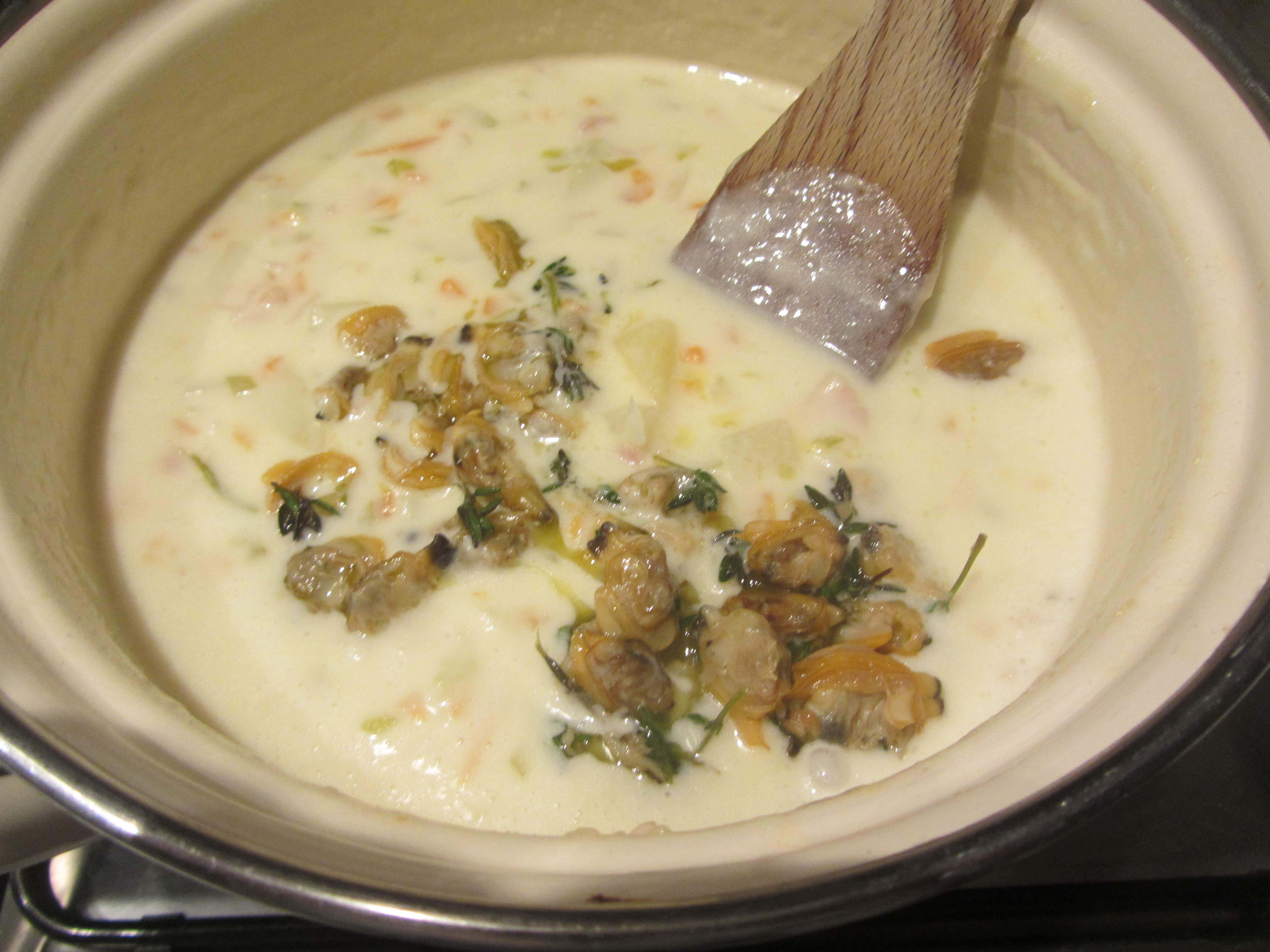 Aggiungere la panna e le vongole e proseguire la cottura per altri 10 minuti.