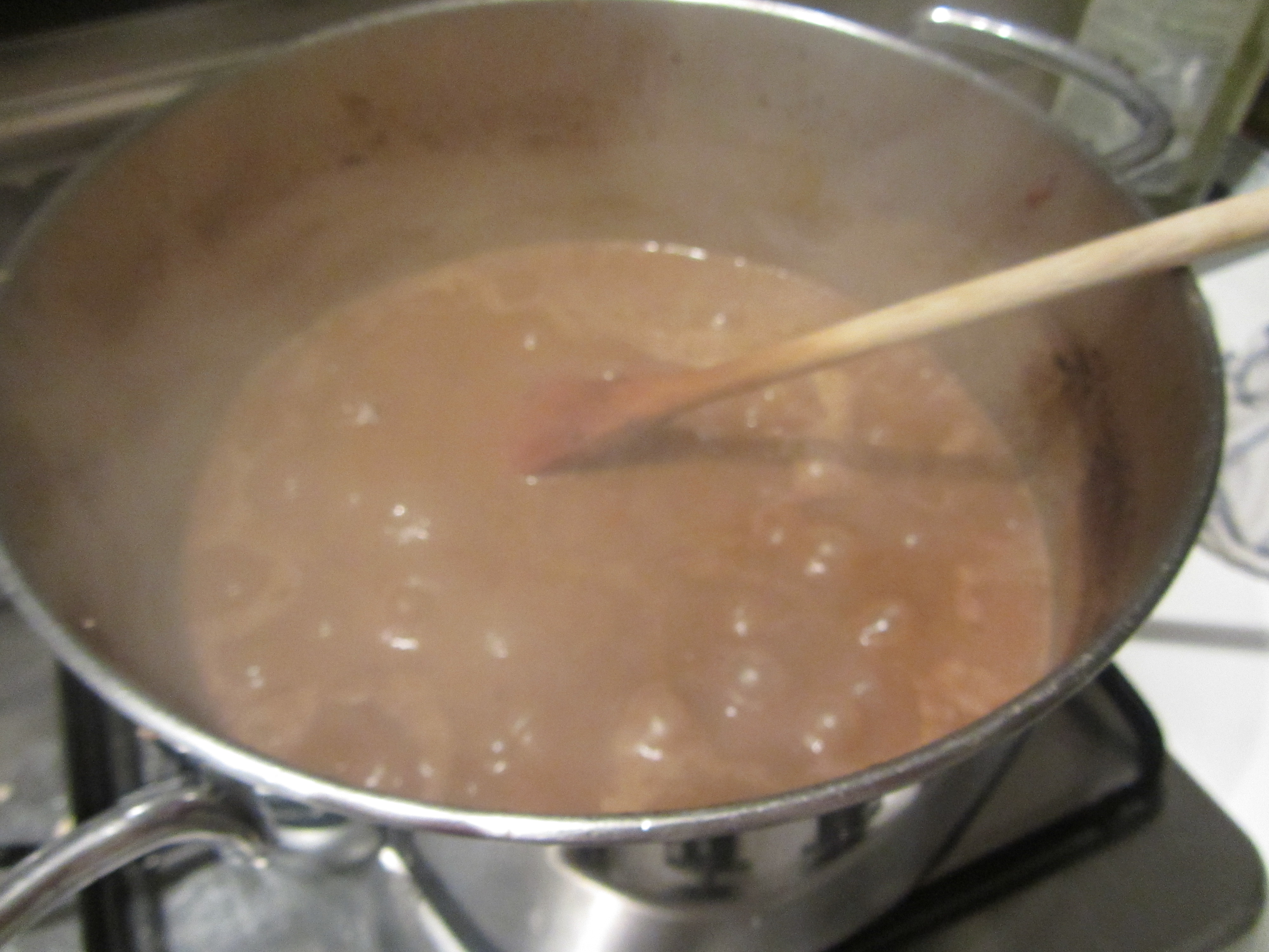 Portare all’ebollizione e, dopo qualche minuto, dopo aver consentito all’alcool di evaporare, abbassare la fiamma, coprire a semicoperchio e cuocere per 3 ore. A metà cottura regolate di sale utilizzando sale grosso.
