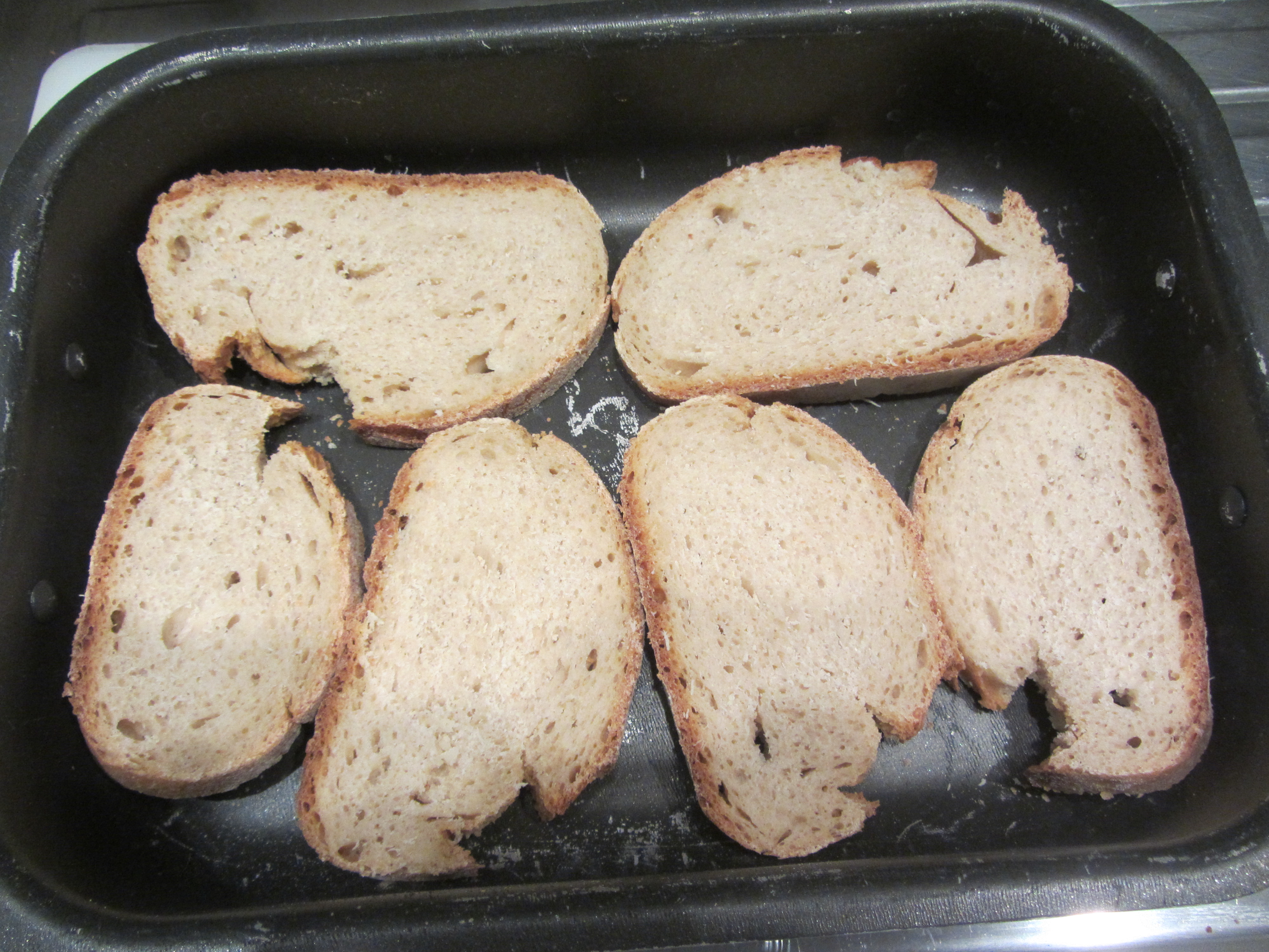 Tagliate tante fette alte un dito e in numero sufficiente a coprire il fondo di una teglia e tostatele a 180°C per 15 minuti, girandole a metà del tempo.