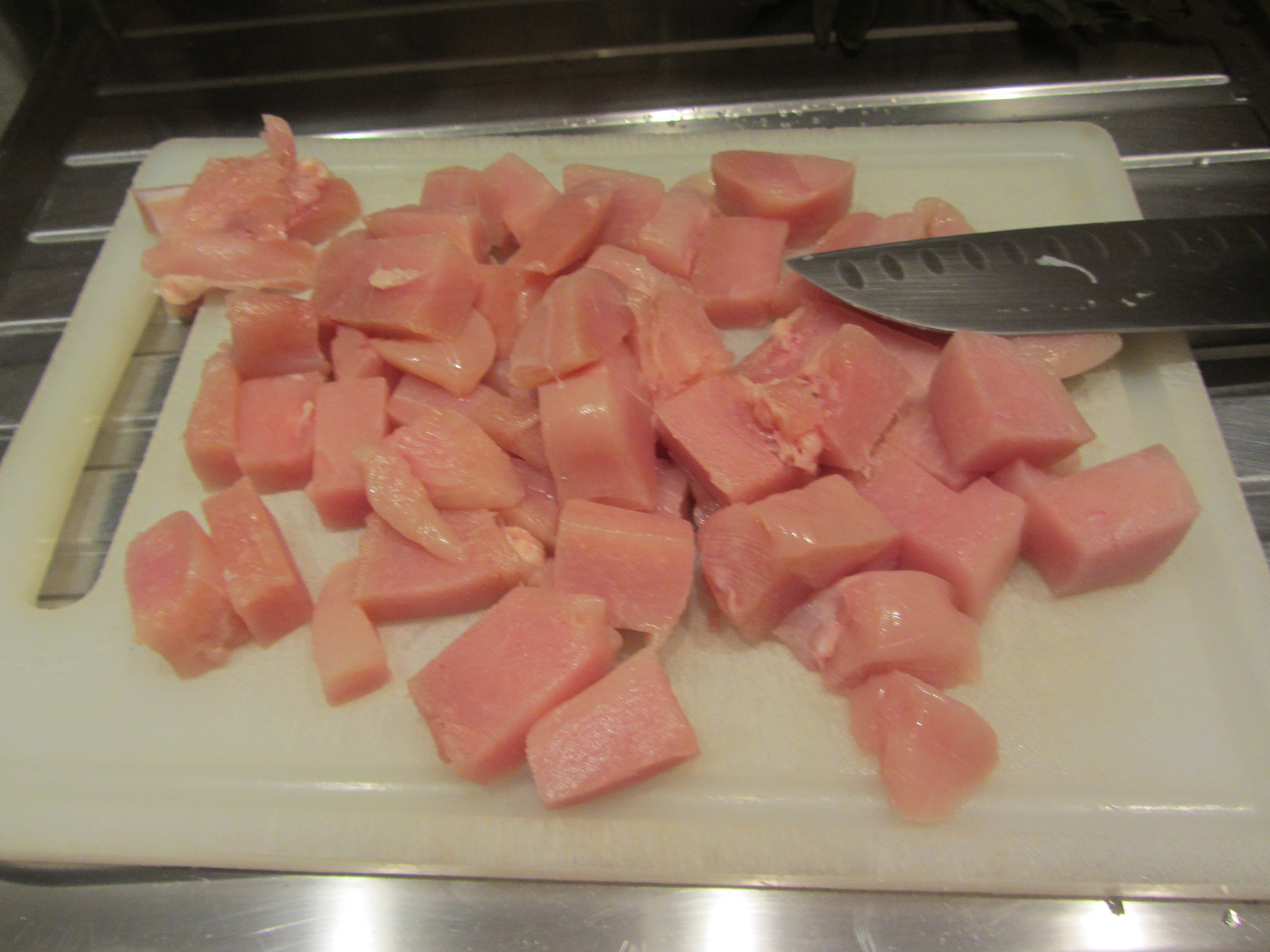 Infilzate i cubetti di pollo e a metà dello spiedino altra pancetta.