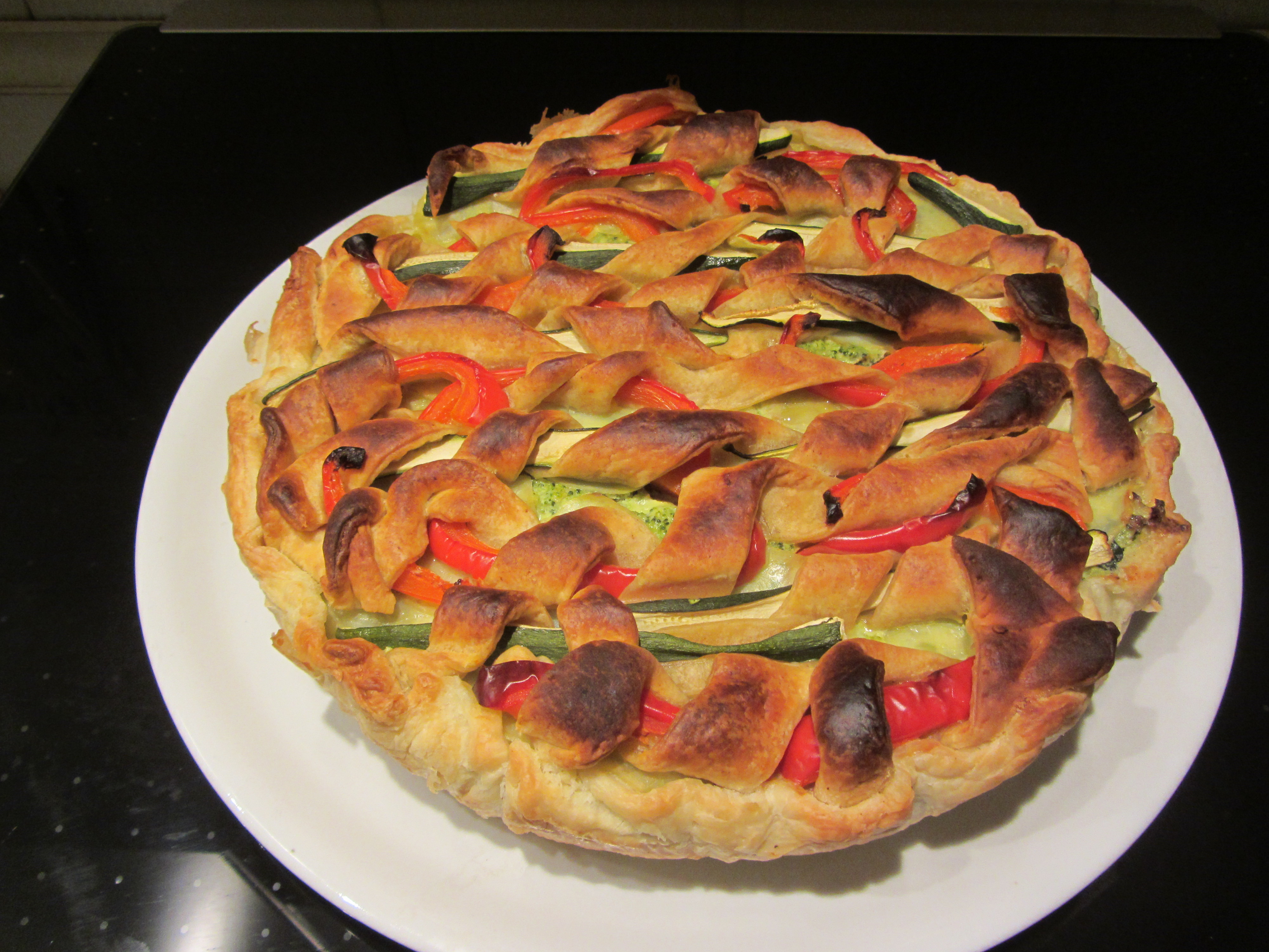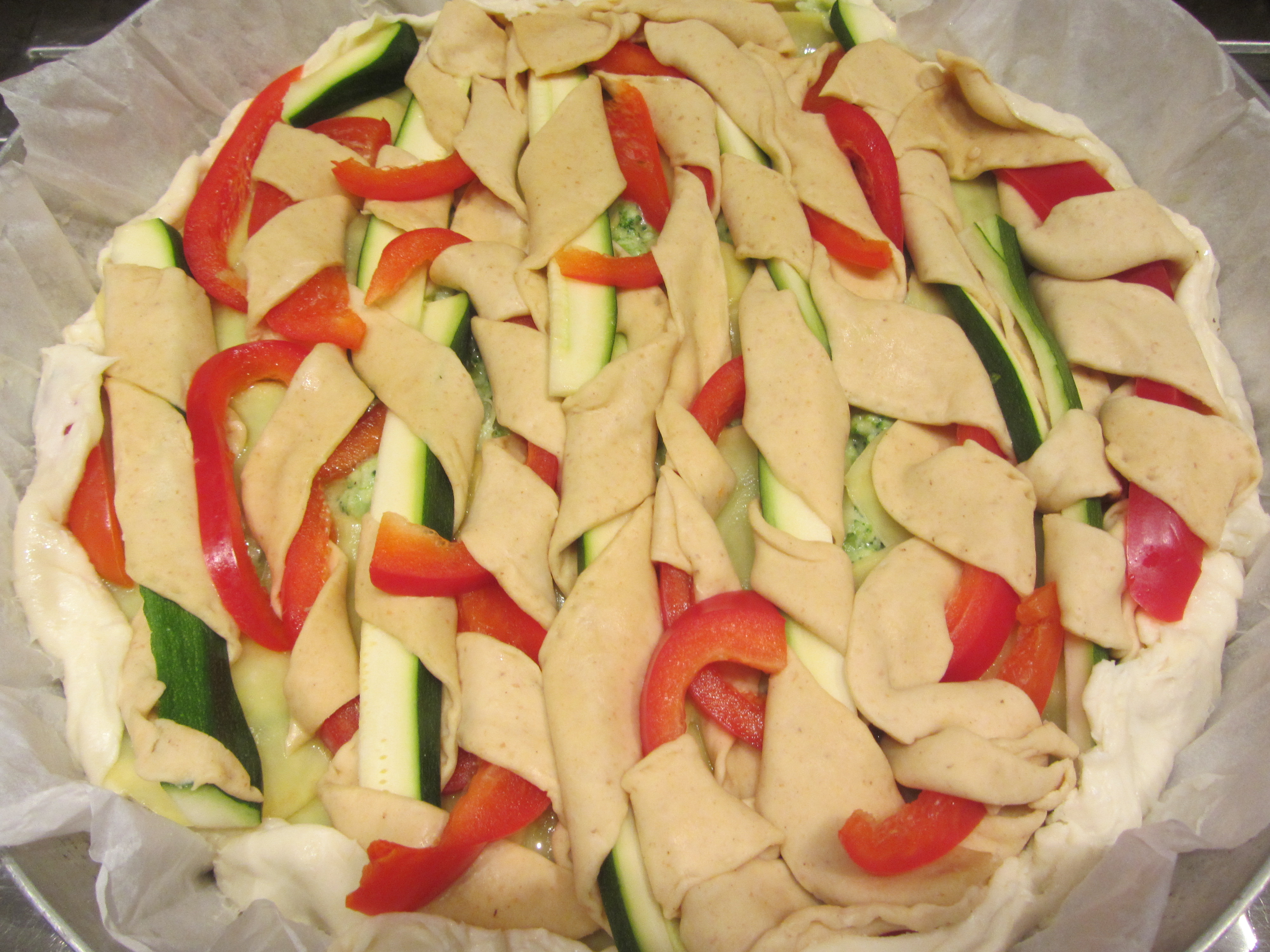 Coprite con delle trecce di pasta sfoglia peperoni e zucchine. Alternando.