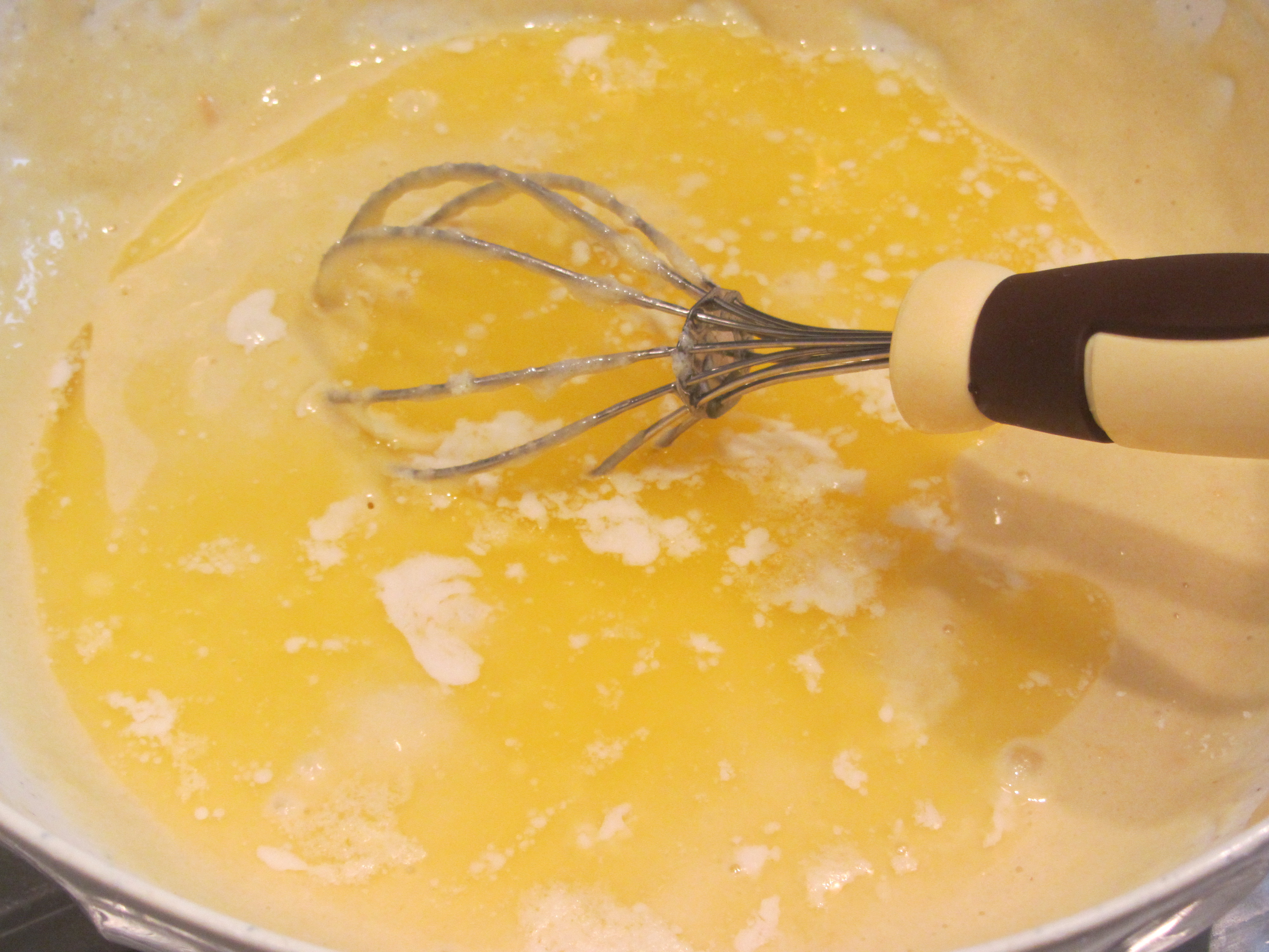 Aggiungerlo alla miscela solida insieme alle uova (2 intere e due tuorli)