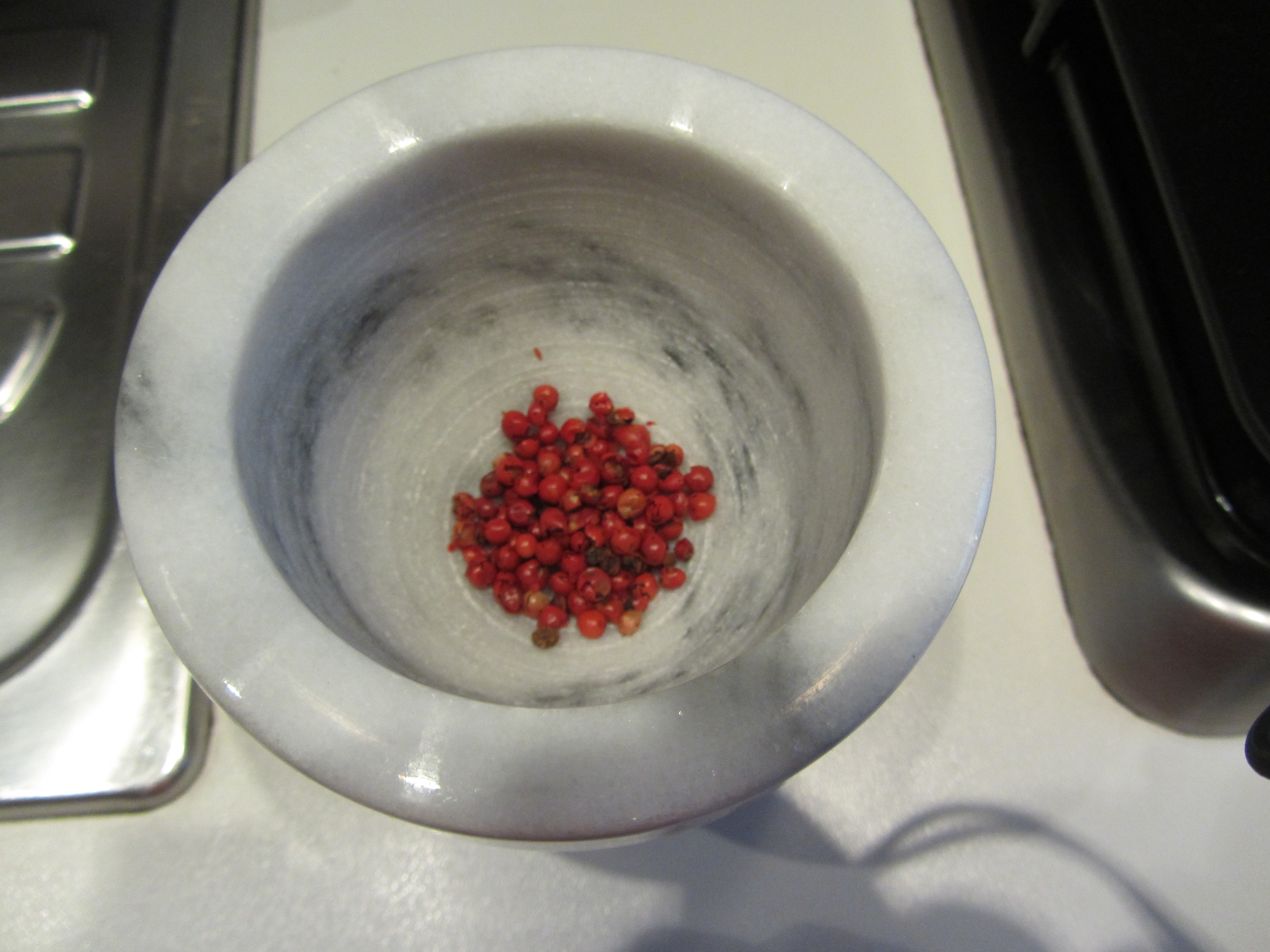 In un mortaio porre delle bacche rosa (pepe rosa) secche.