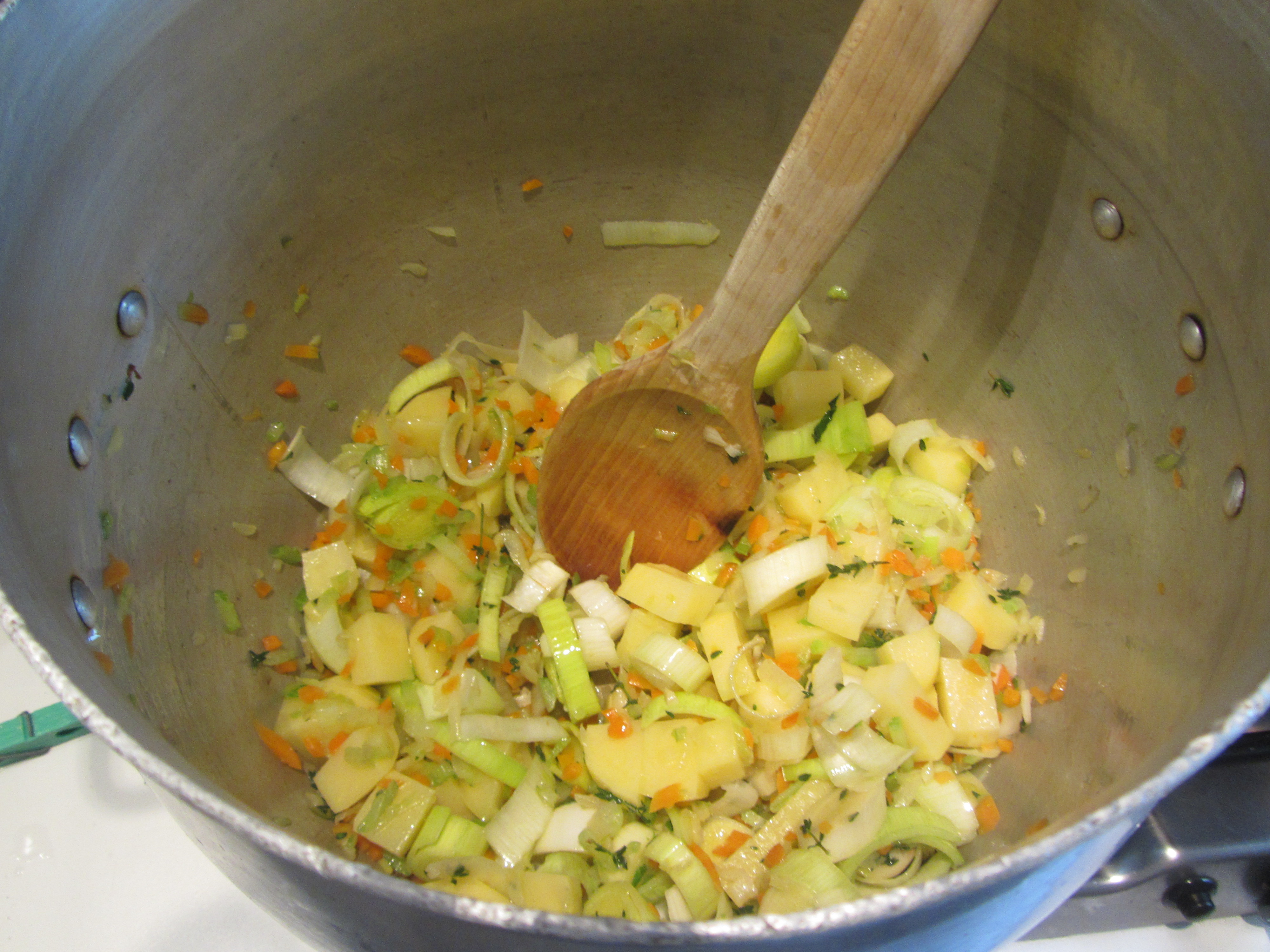 Riducete le patate pelate in cubetti ed il porro in rondelle. Spezzate le foglie di verza, bietola ed erbette.