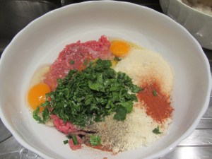 carne trita, formaggio parmigiano, formaggio pecorino, sale, prezzemolo tritato, pepe nero, paprika dolce, uova, aglio in polvere.