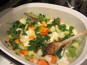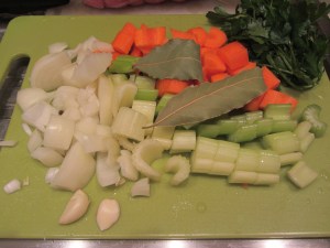 Lavate accuratamente la cipolla, l’aglio, la carota, il sedano, il prezzenolo e l’alloro. Tritate molto grossolanamente. Se lo tritate finemente la carne non rosola e rimarrà dura alla fine perchè perde tutti i succhi, in questo caso lìil battuto va aggiunto dopo aver rosolato la carne e sigillato, quindi, la superficie.