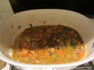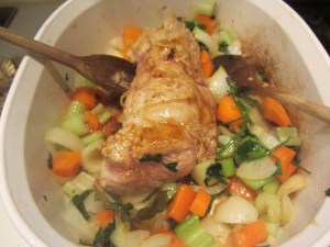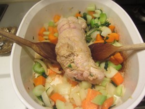 Aggiungete acqua calda per 2/3 dell’altezza della pentola e coprite in diagonale. Laciate cuocere circa un’ora e mezza girando la carne due, tre volte. (La durata della cottura dipende dalla grandezza del taglio, lo spinacino in foto aveva un peso di circa 700 grammi.)