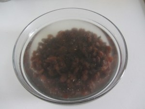 Mettete l’uvetta a mollo in acqua tiepida e fate rinvenire per 30 minuti. Poi strizzatela perfettamente ed asciugatela.