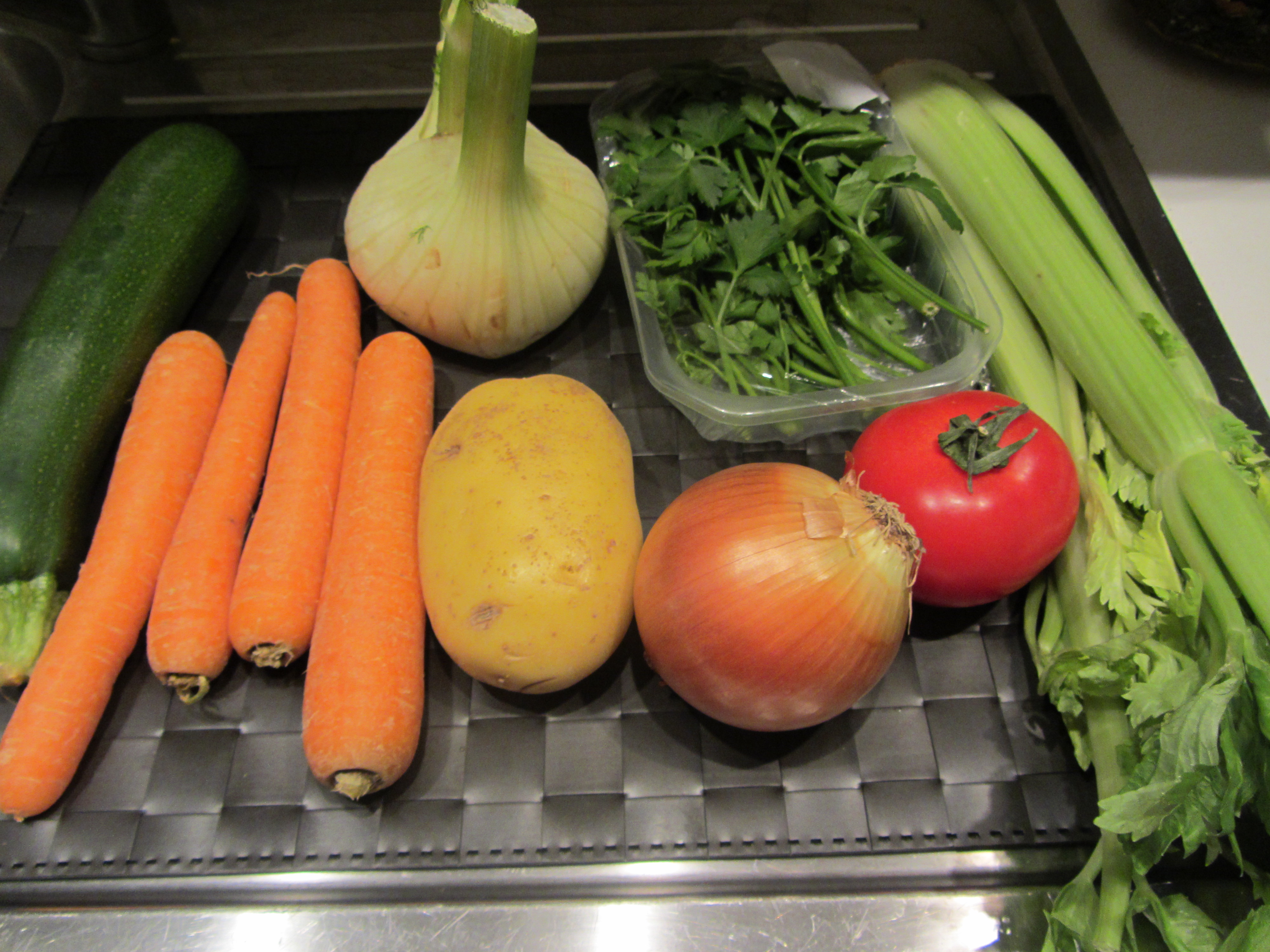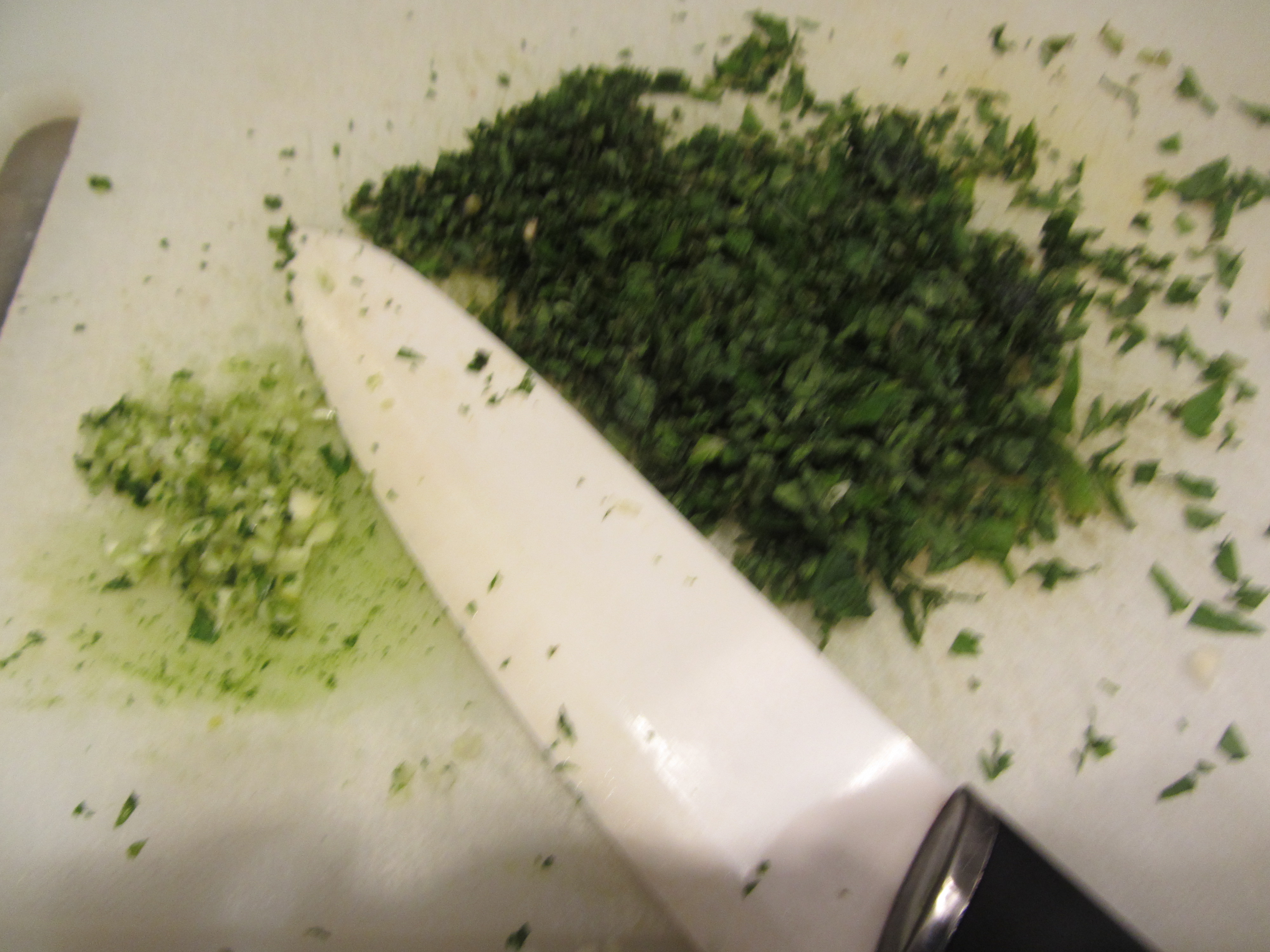 Tritatle finemente, e fate altrettanto con uno spicchio di aglio privato del germoglio.