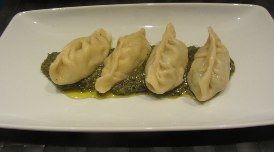 Primo incontro con questo piatto….. un’estate in Sardegna. Sono in pratica dei ravioloni con ripieno di patate e menta che in Sardegna sono conditi con sugo di pomodoro, in questo caso ho pensato di rendere più complesso il gusto di questo primo utilizzando un pesto di noci come condimento.