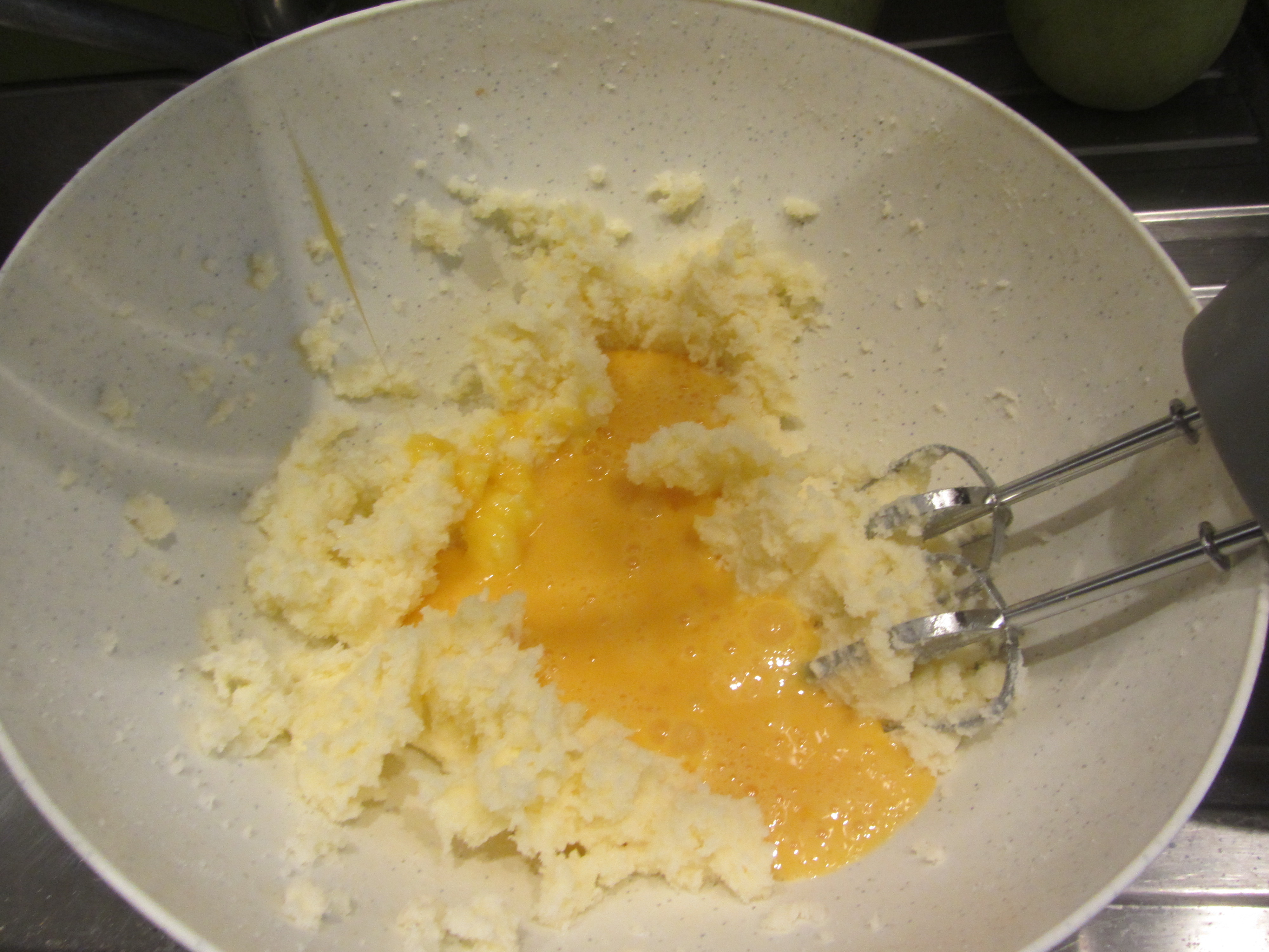 Aggiungere la miscela farina/fecola, in porzioni, alla crema di tuorli d’uova, sbattendo.