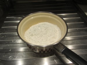 Andiamo con la glassa… zucchero a velo trasferito in un pentolino, qualche cucchiaio di acqua, mescolate ed aggiungete acqua poco alla volta fino a raggiungere una consistenza cremosa.