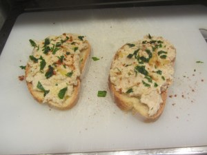 Tostiamo le fette di pane e abbondiamo nella farcitura. Prepariamo i crostini circa 30 minuti prima di servirli.