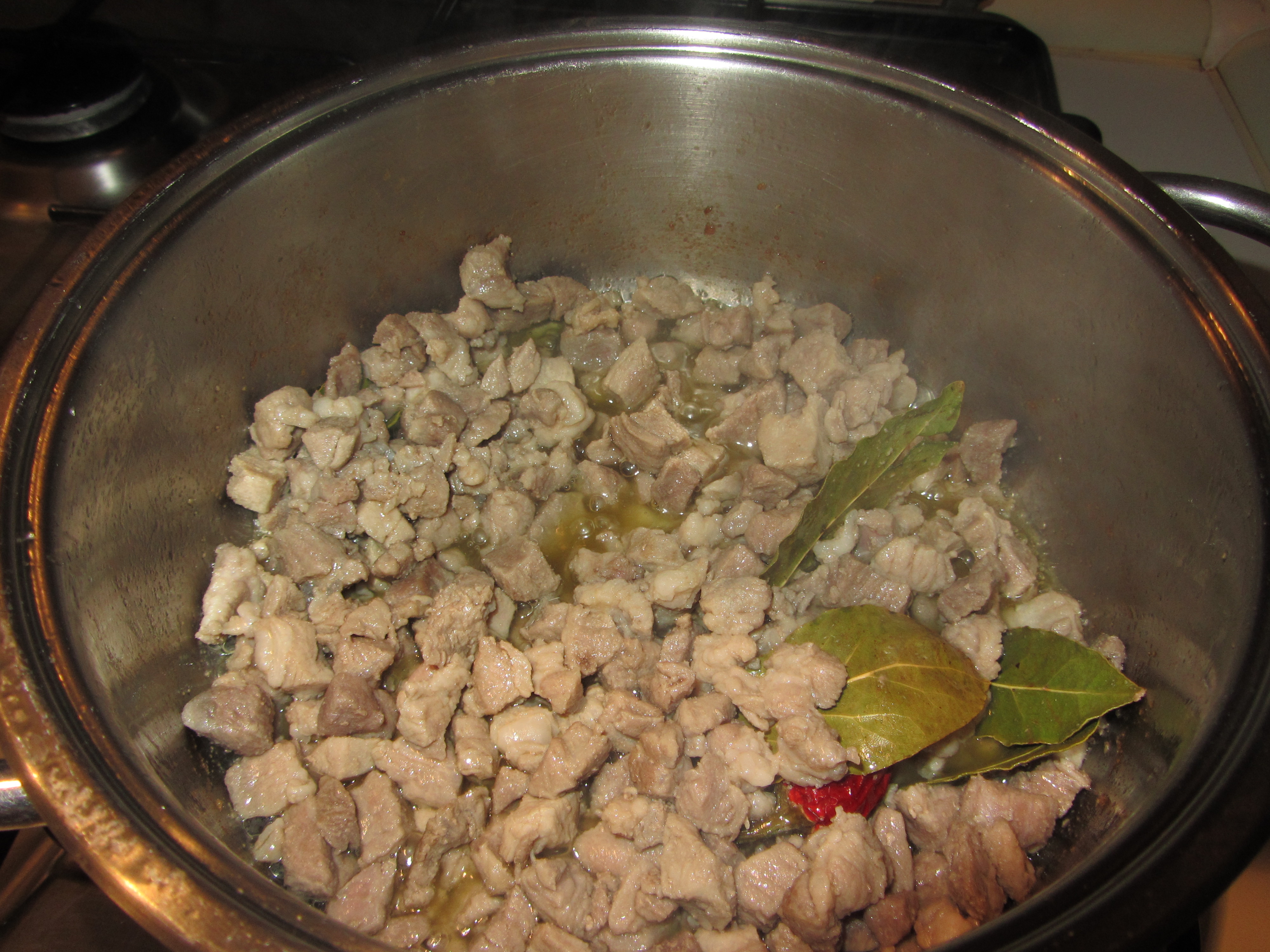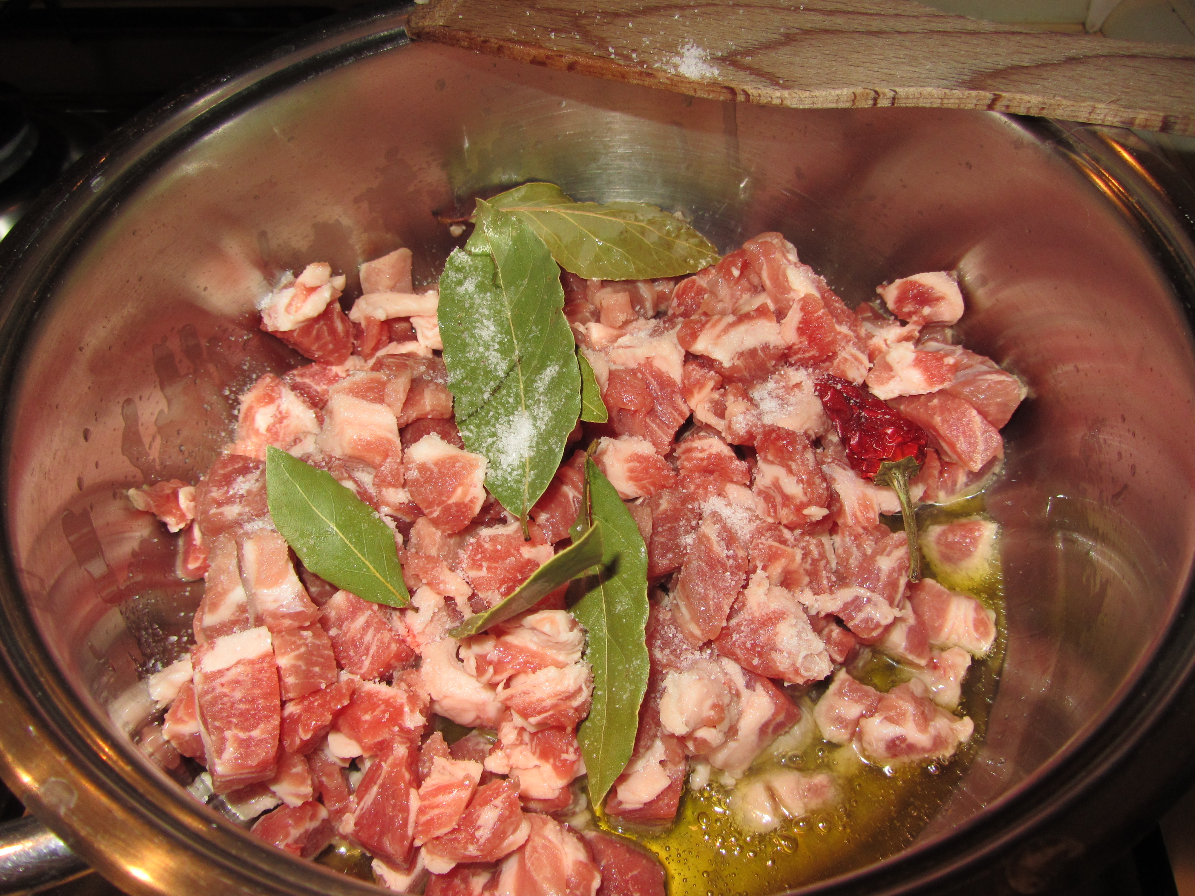 Fate scaldere l’ olio in un tegame, ed una volta ben caldo unire la carne, il sale, l’ alloro ed il peperoncino.