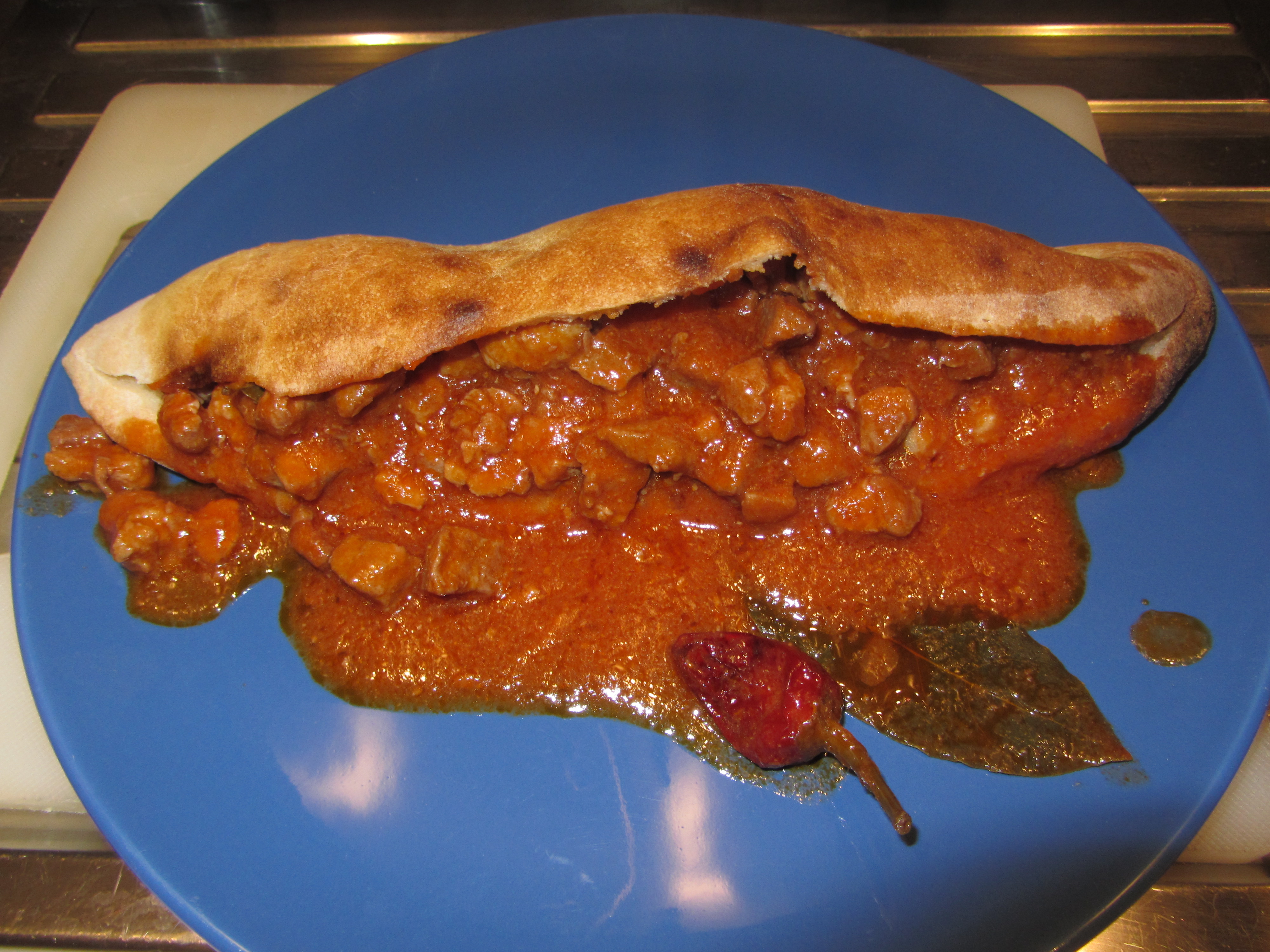 Una menzione particolare va al pane utilizzato per accompagnare questo spezzatino: la pitta, ed in particolare la “pitta muscia”. Pane caratteristico della forma di una ciambella dalla sezione tubolare; la pitta muscia invece è appiattita e risulta “moscia” appunto. Mi permetto di mutuare una foto dal web, in quanto fuori da Catanzaro questo pane è impossibile da trovare:
