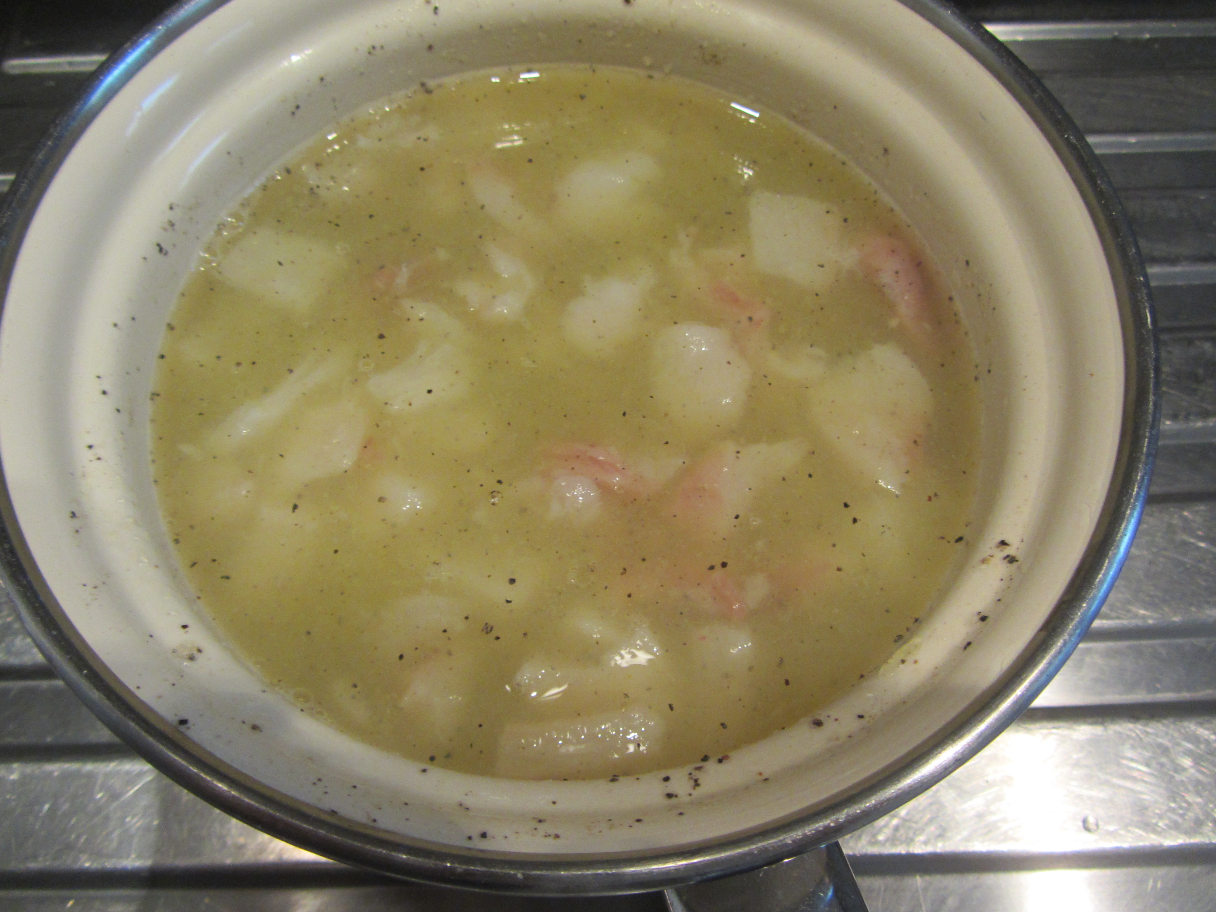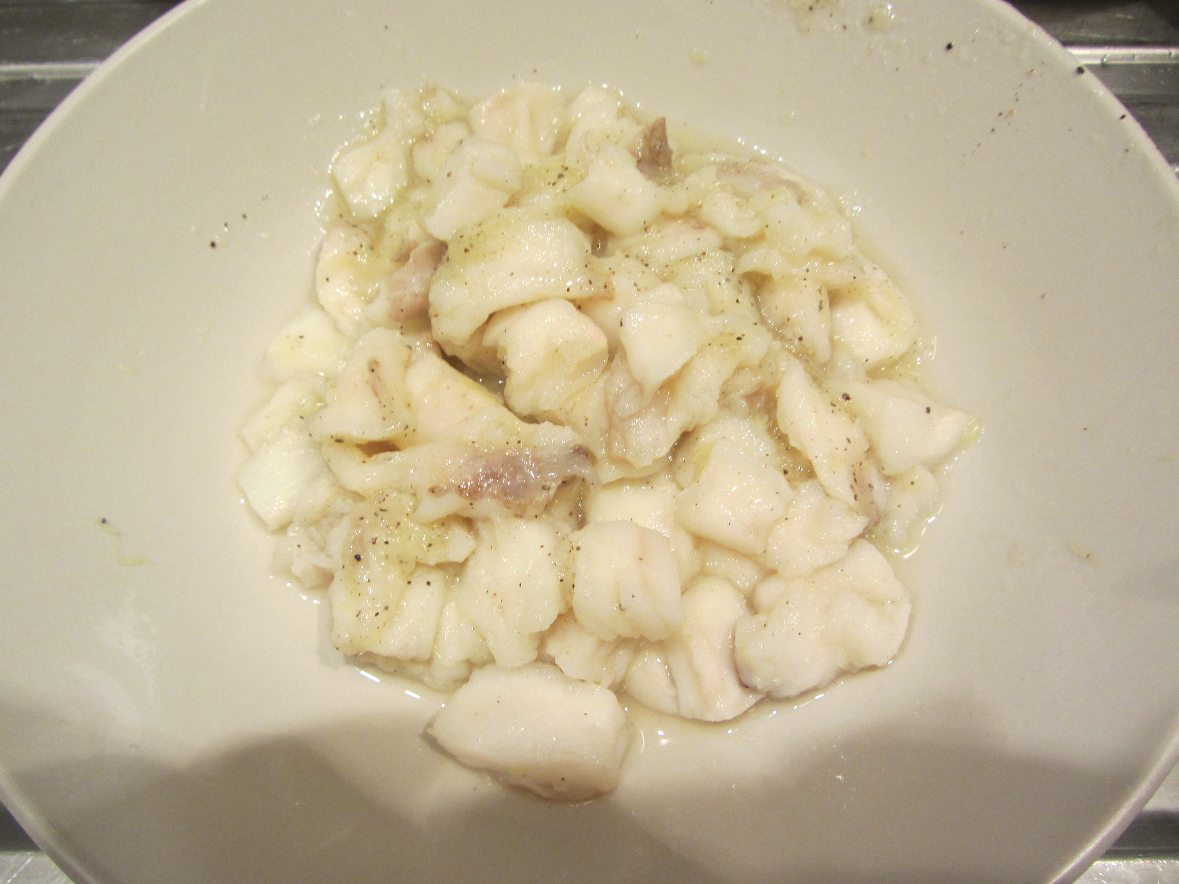 Lessate i filetti di merluzzo come da indicazioni del produttore, normalmente sei minuti da quando l’acqua riprende a bollire. Acqua preventivamente salata ovviamente. Metetteli a scolare.