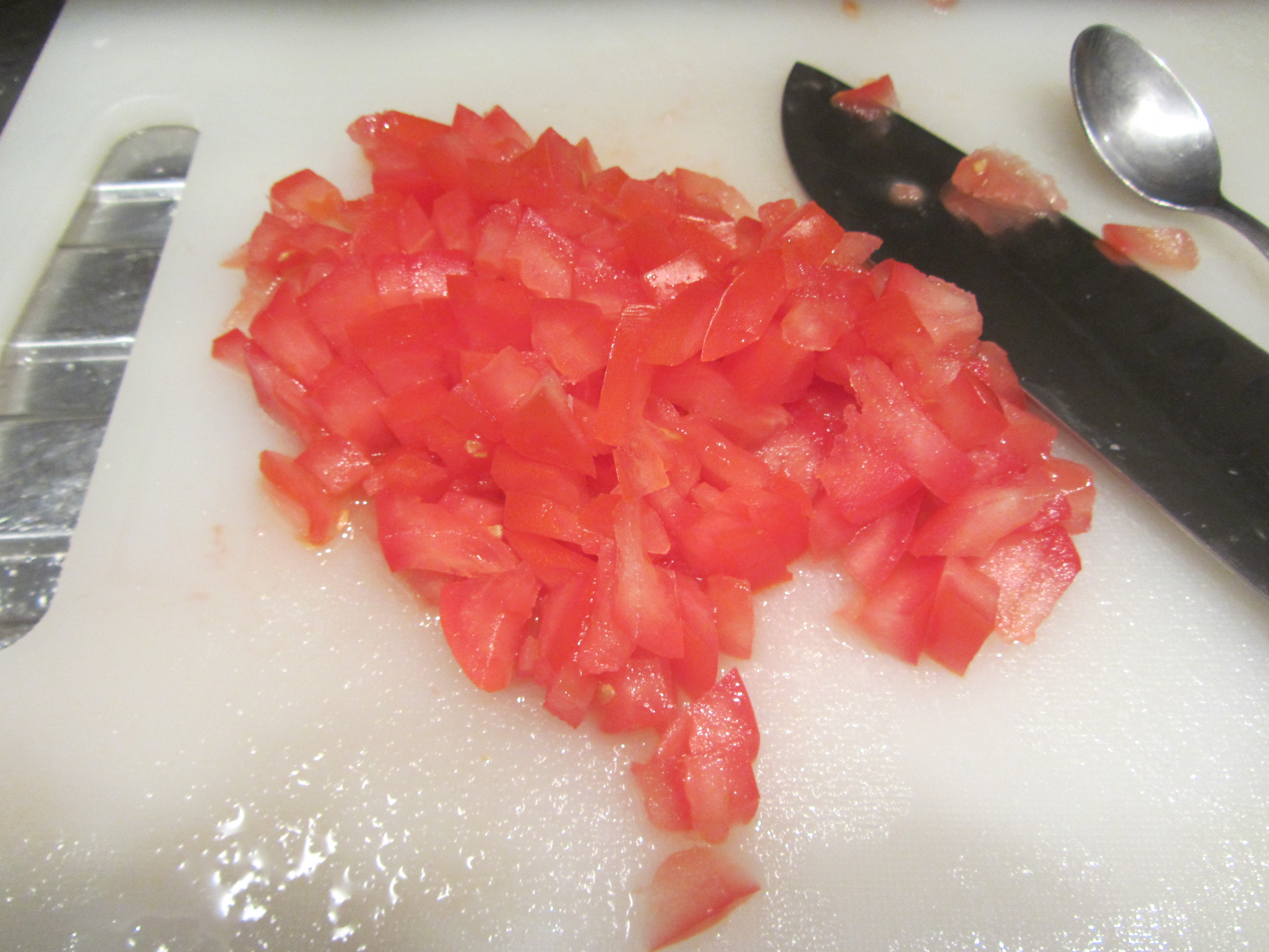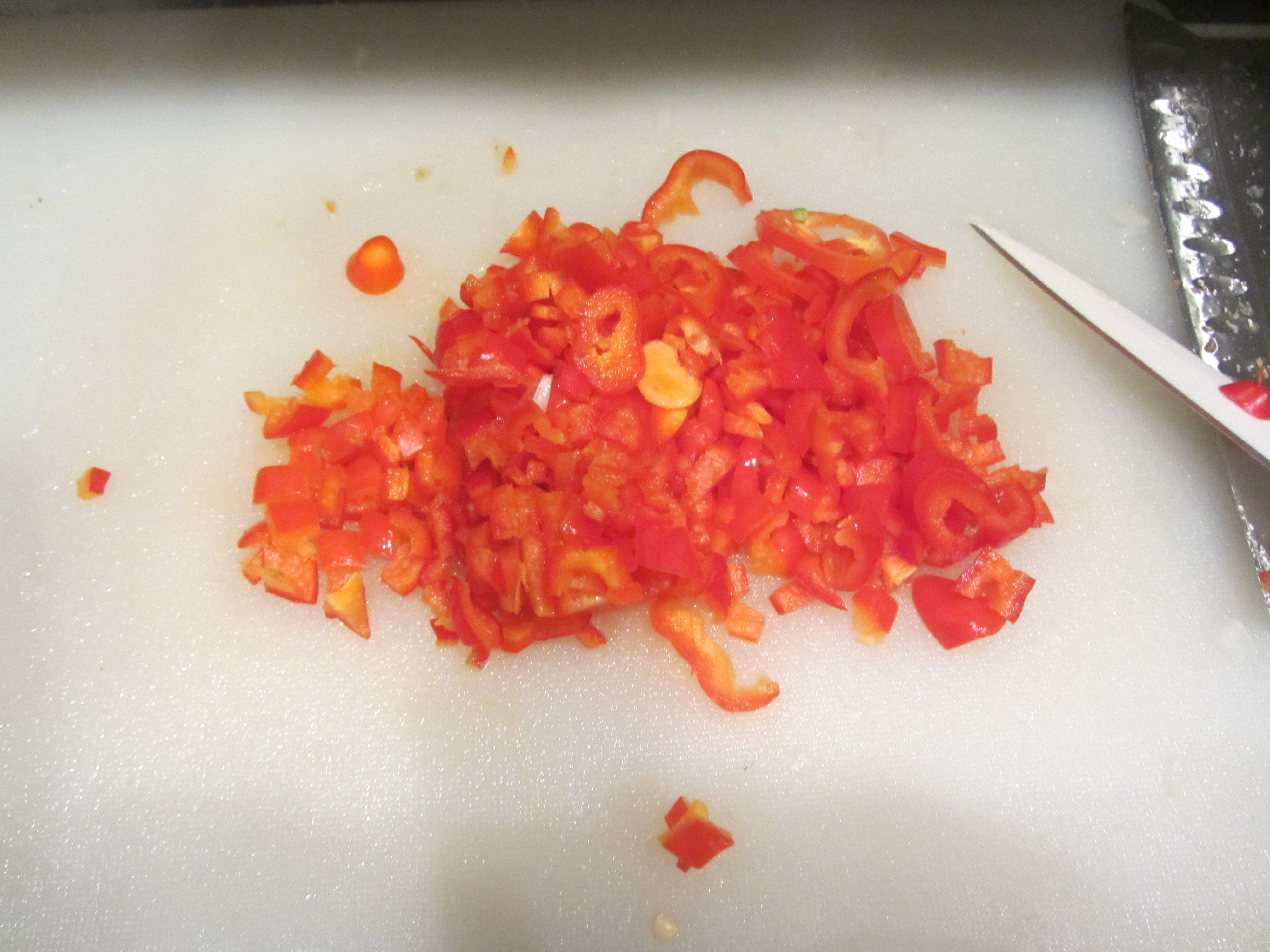 Pulite 2 peperoni frigitelli privandoli del picciolo, tagliandoli a metà nel senso della lunghezza, ed eliminando i semi. Ciascuna metà deve poi essere ridotta in striscioline corte nel senso della larghezza.