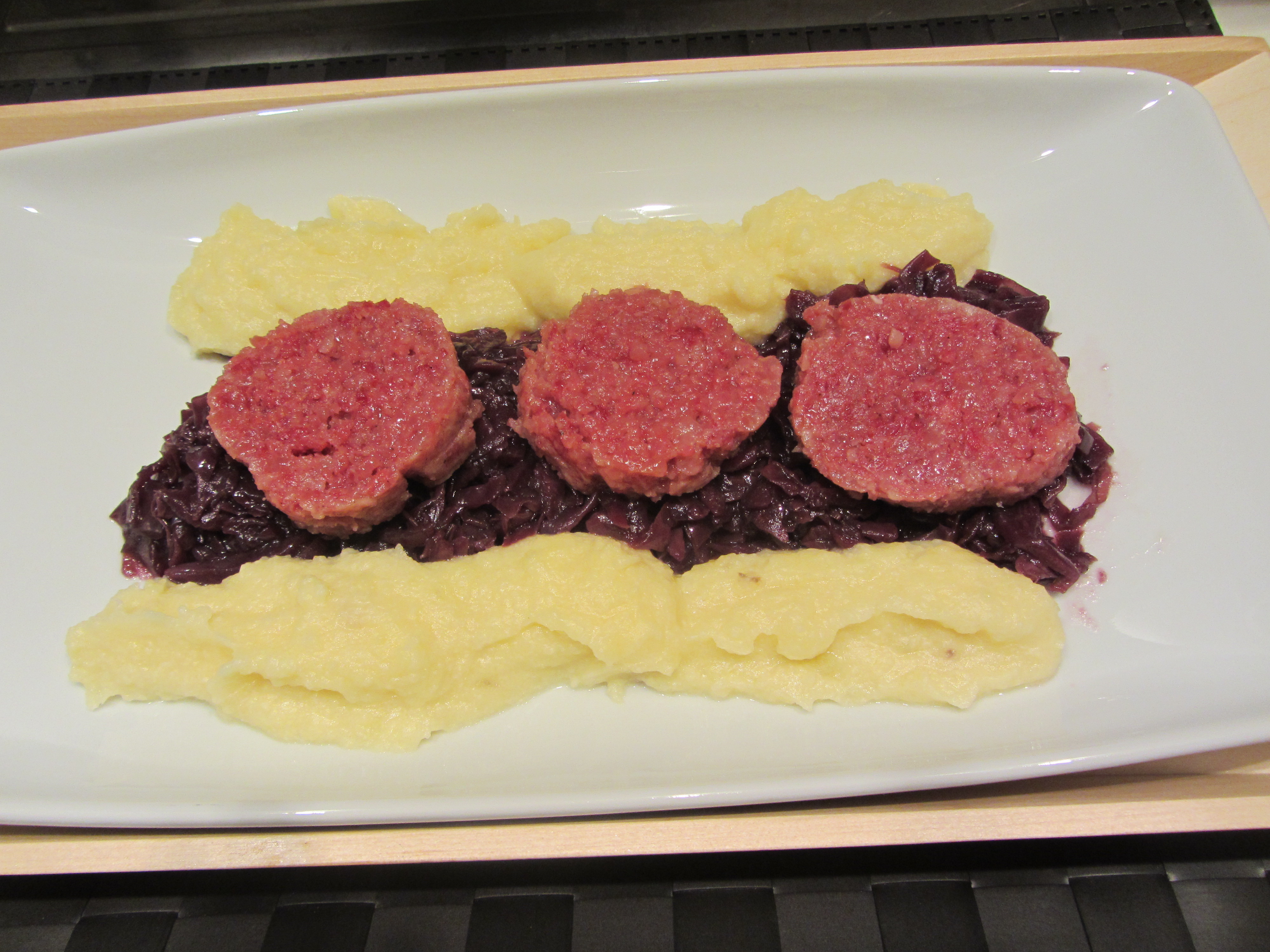 A questo punto servite il cotechino affettato con due pallette di hummus spolverate una con curcuma ed una con paprika dolce.
