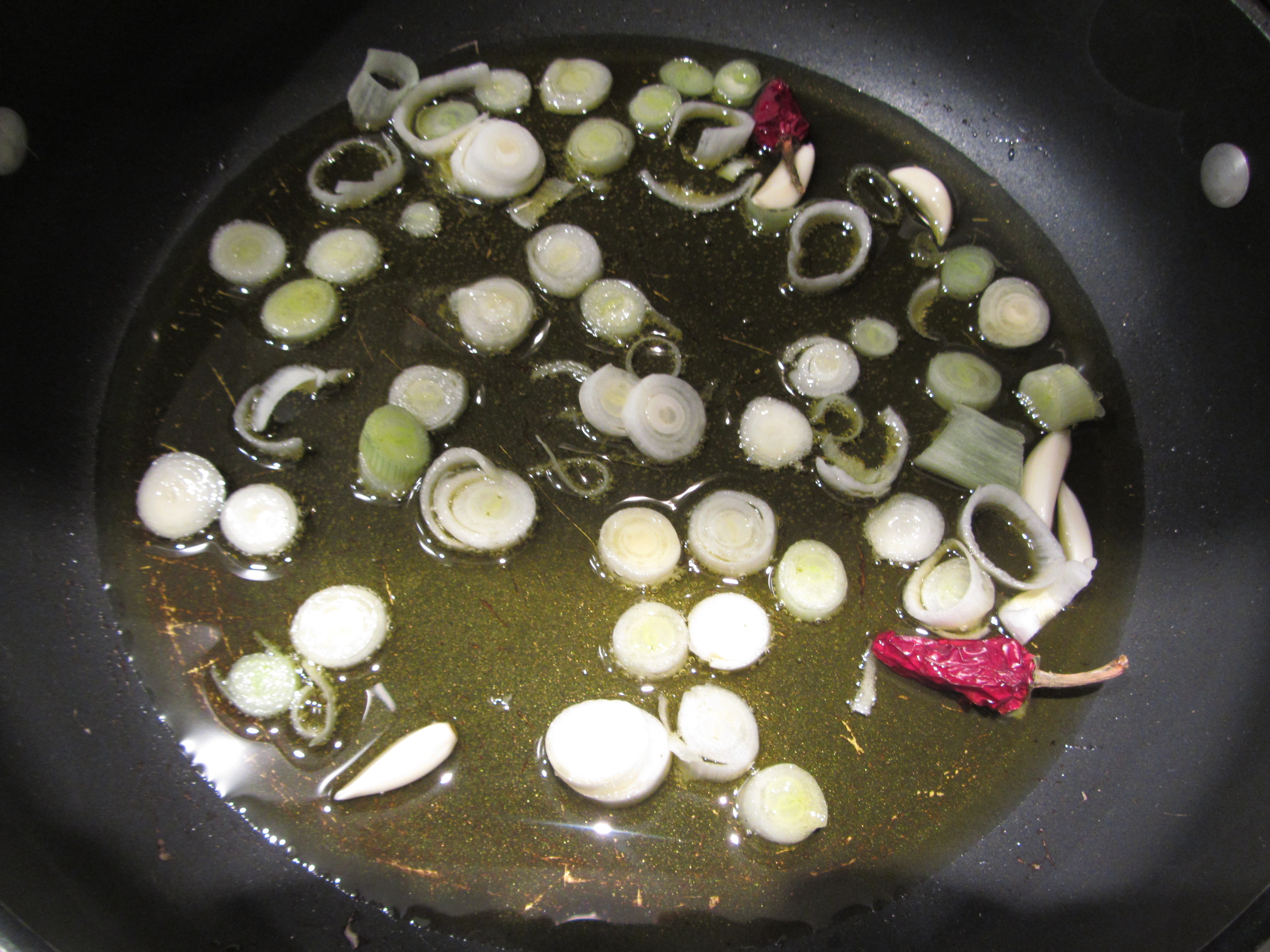 In una casseruola di dimensioni adatte a contenere il pesce, fate rosolare nell’olio, leggermente, l’aglio, il peperoncino ed i cipollotti, a fiamma media, con poco sale.