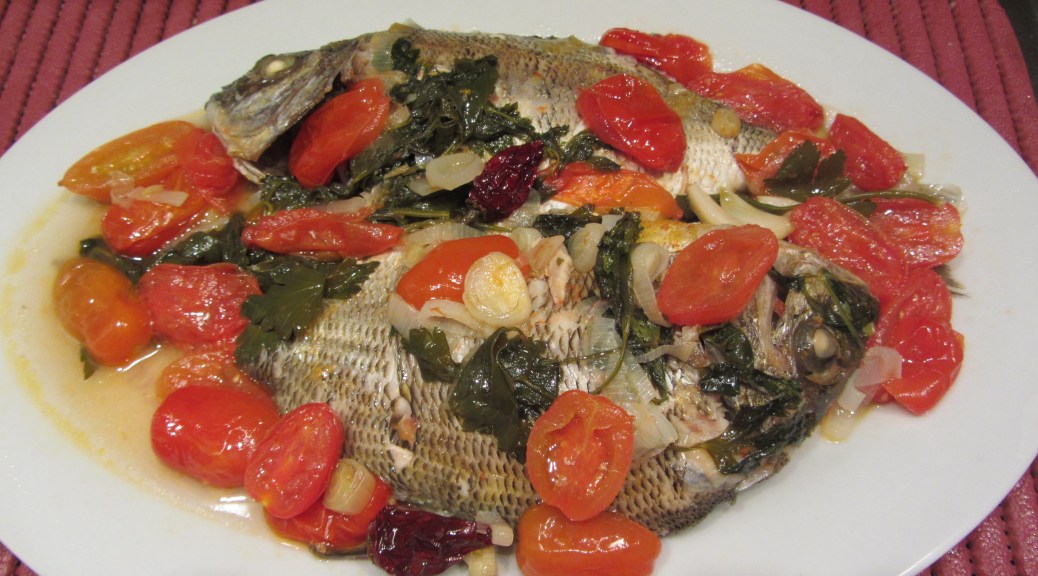 Lasciate trascorre altri cinque minuti scarsi e girarlo dall’altro lato. Non dovrete giararlo più sino a fine cottura. Coprite con un coperchio lasciandolo sollevato mediante un cucchiaio di legno, o con un foglio di alluminio, ed abbassate la fiamma. Il tempo di cottura dipenderà, ovviamente, dalle dimesioni del pesce. Per pesci di circa 400 grammi saranno sufficienti 25 minuti. Spegnete e lasciare intiepidire.