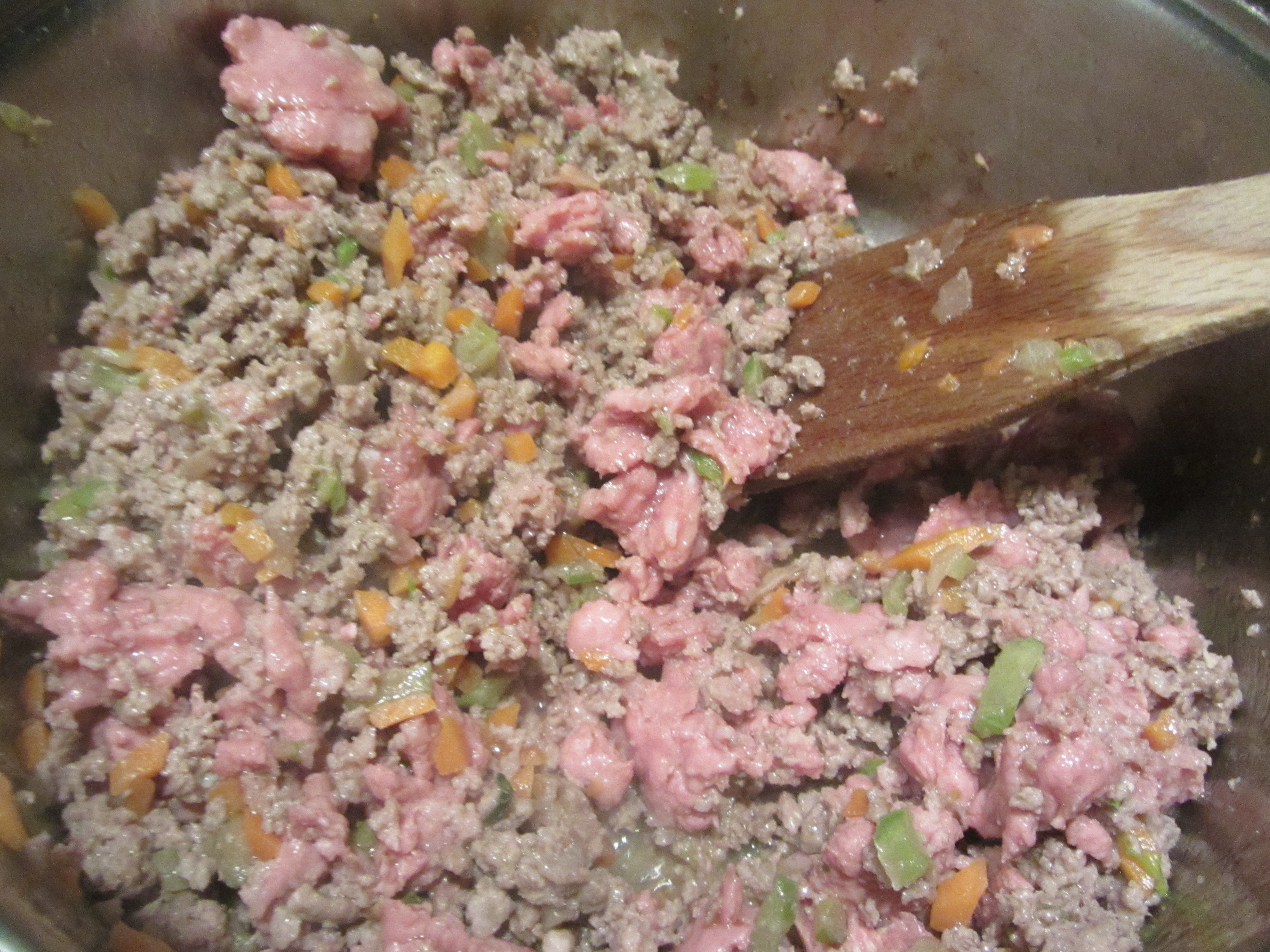 Quando la cipolla diventa trasparente aggiungete la carne trita e la pasta di salame, o una salsiccia sbriciolata. Rosolate.