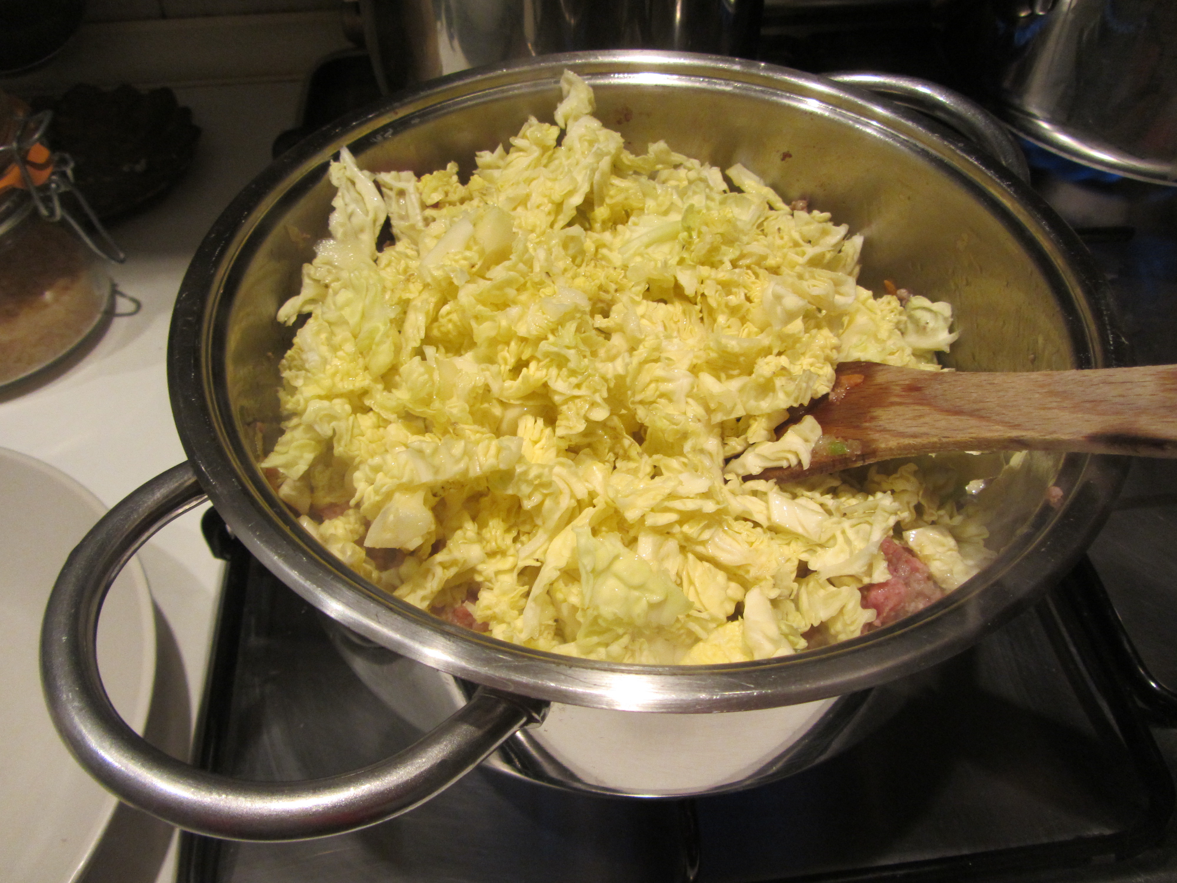 Quando la carne comincia a perdere i suoi succhi aggiungere le striscioline di verza.