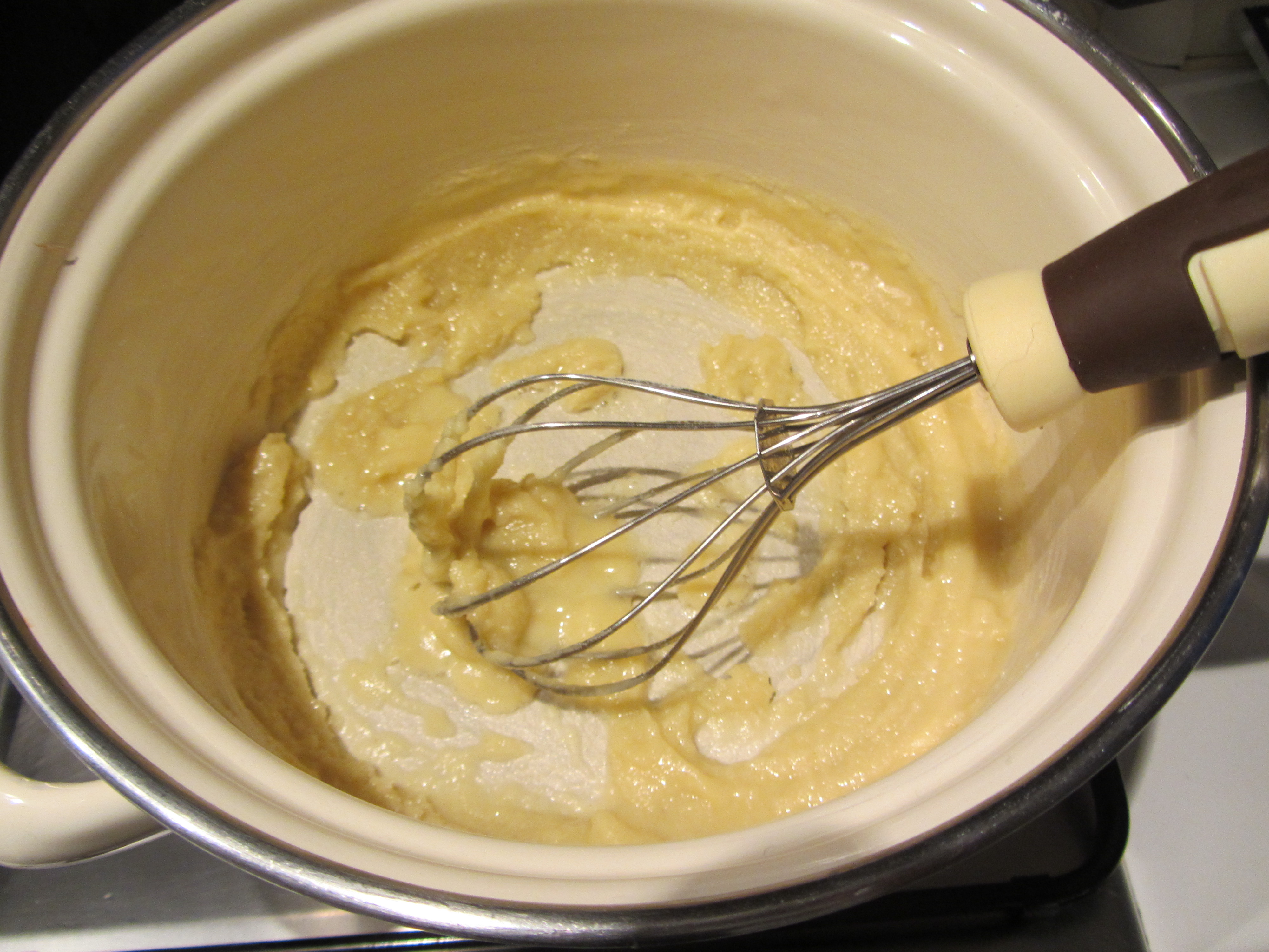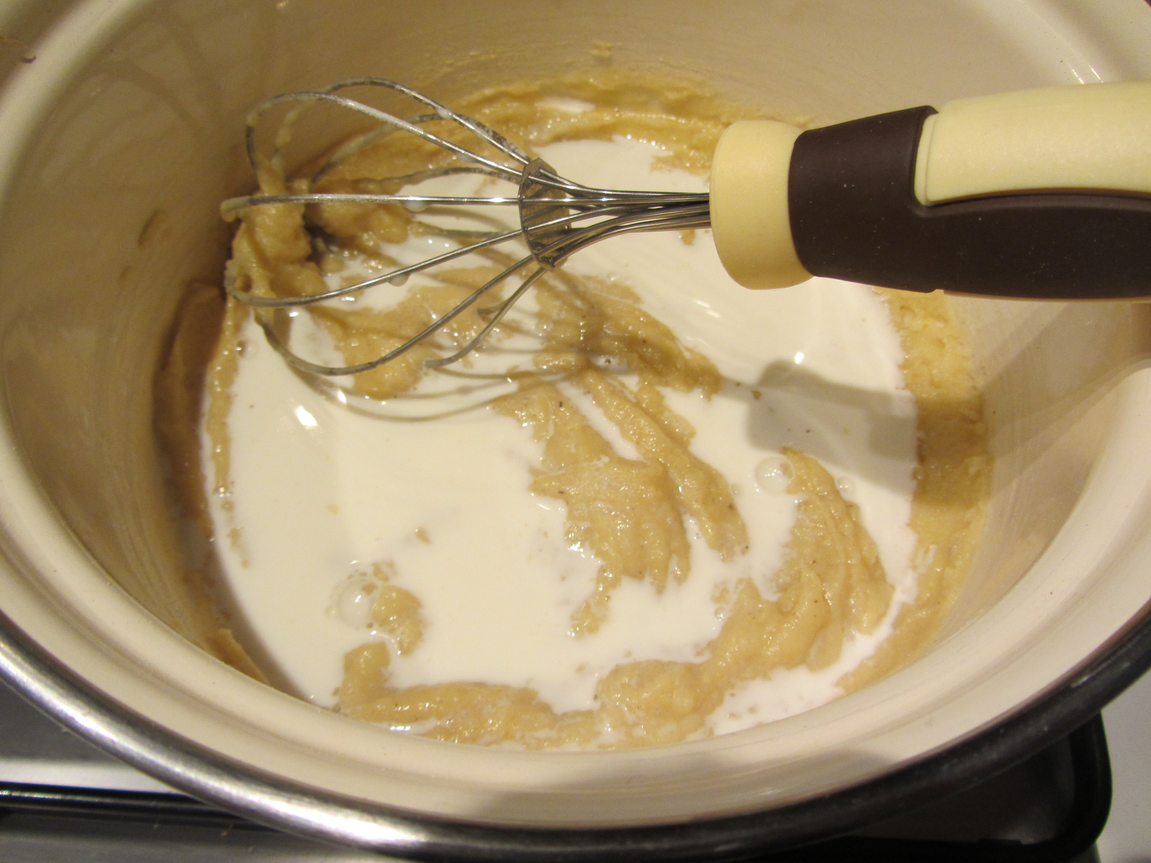 Aggiungete il latte tiepido a piccole porzioni, sempre continuando a mescolare.
