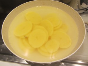Eliminare le parti verdi ed affettare per lungo con uno spessore di mezzo centimetro.