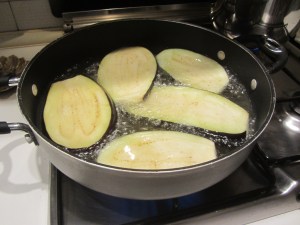 Strizzare e asciugare le melanzane e friggerle in olio di semi.