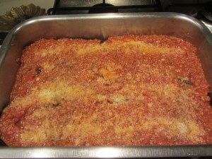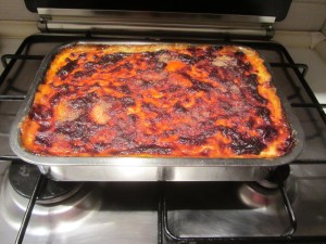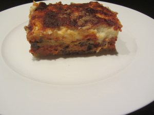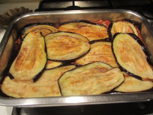Dunque, è ovvio che si tratta di una specie di mussakà, c’è la versione turca e quella greca, libanese, ecc, gli ingredienti cambiano o si aggiungono, besciamella si, besiamella no, carne di ovino. Bon! Io il ragù l’ho fatto col manzo. Accorgimento: la besciamella deve essere sostenuta, se si usa quella troppo liquida non si sforma bene.